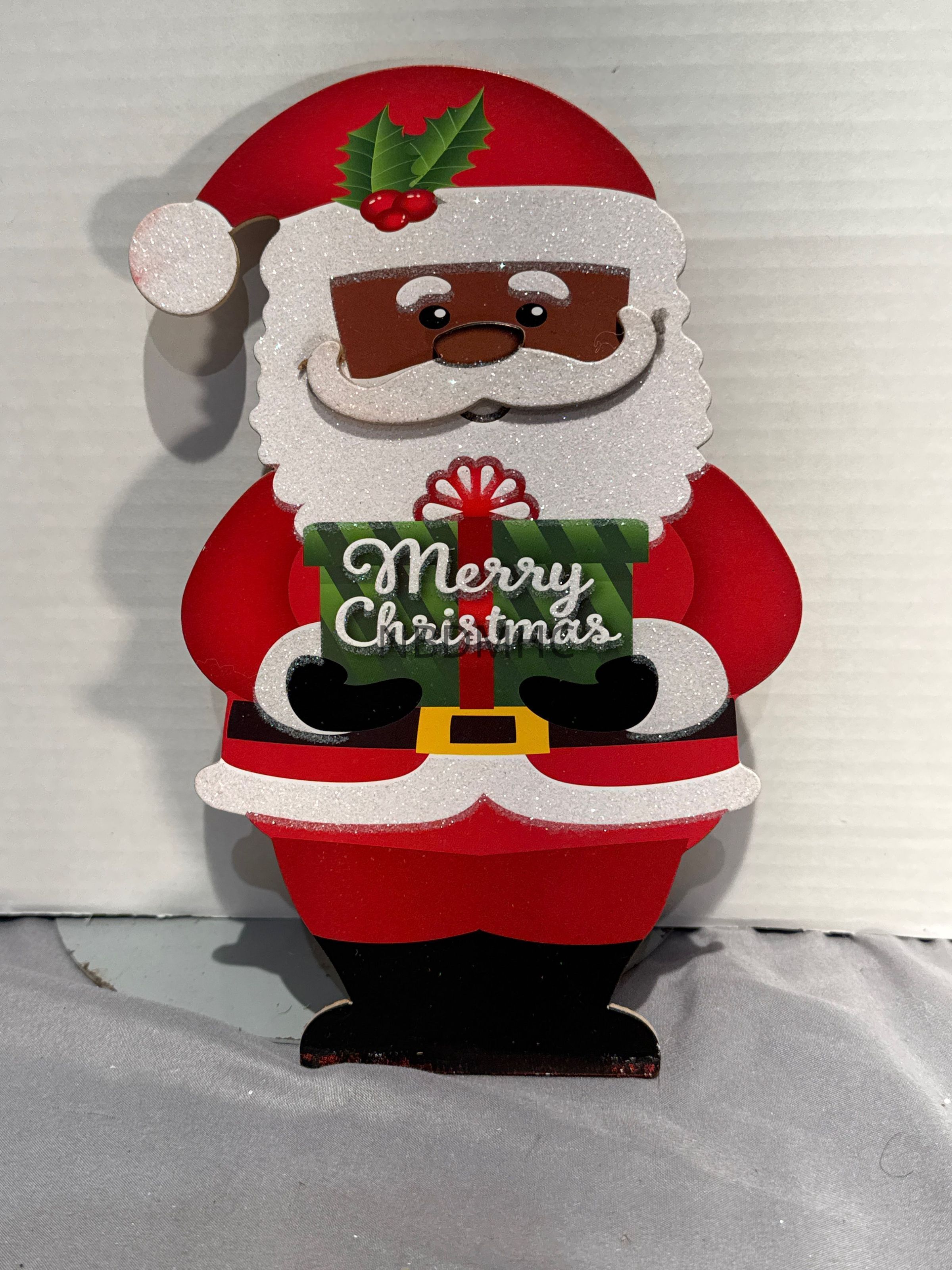 9.5" inch wooden Santa in a red suit carrying a wrapped present with Merry Christmas written on it. Guinness 866.