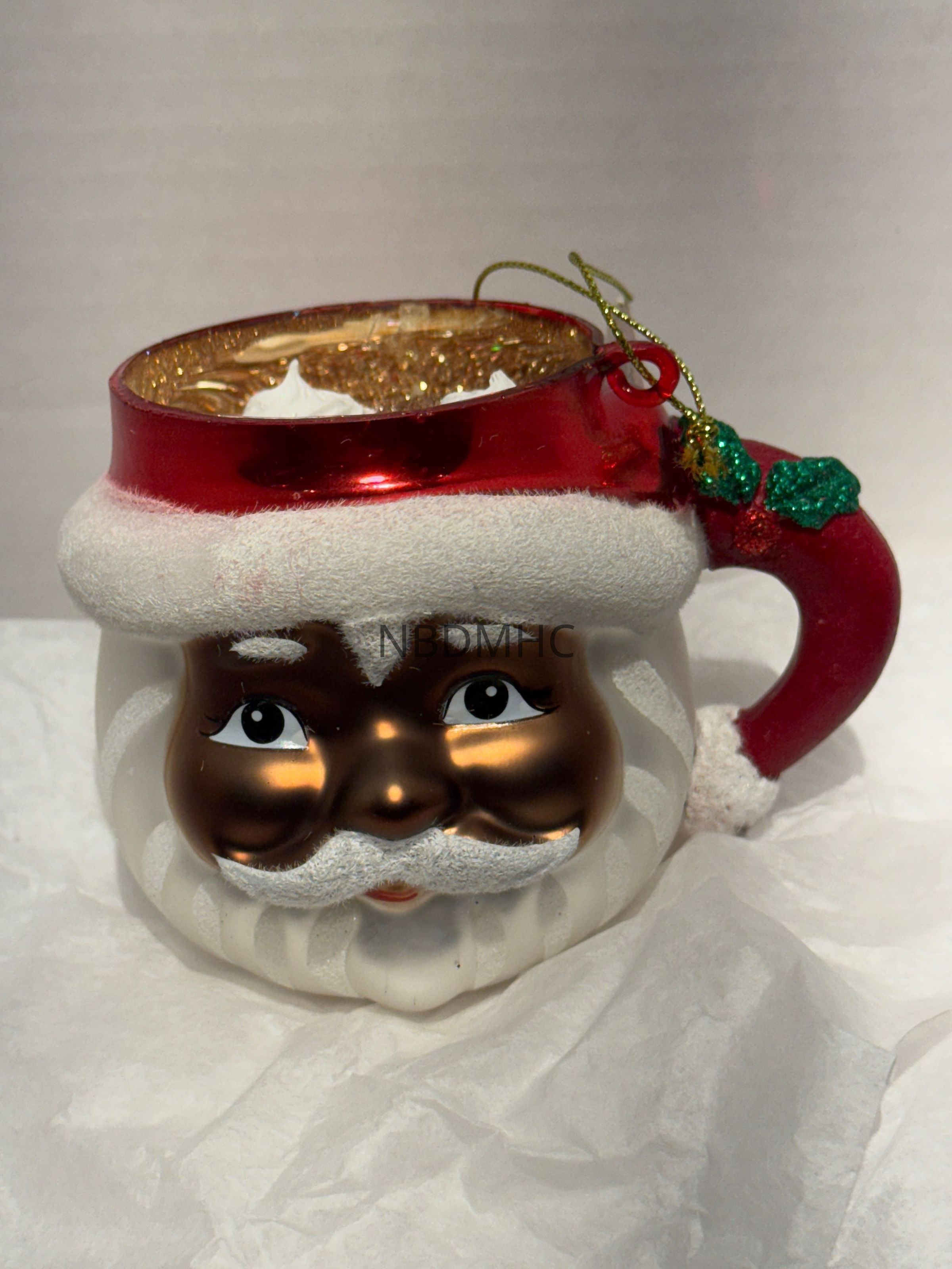 3 inch Santa mug ornament with gold face, sparkling hot chocolate with whipped cream, holly sprig on handle. (1 of 3) Guinness 698