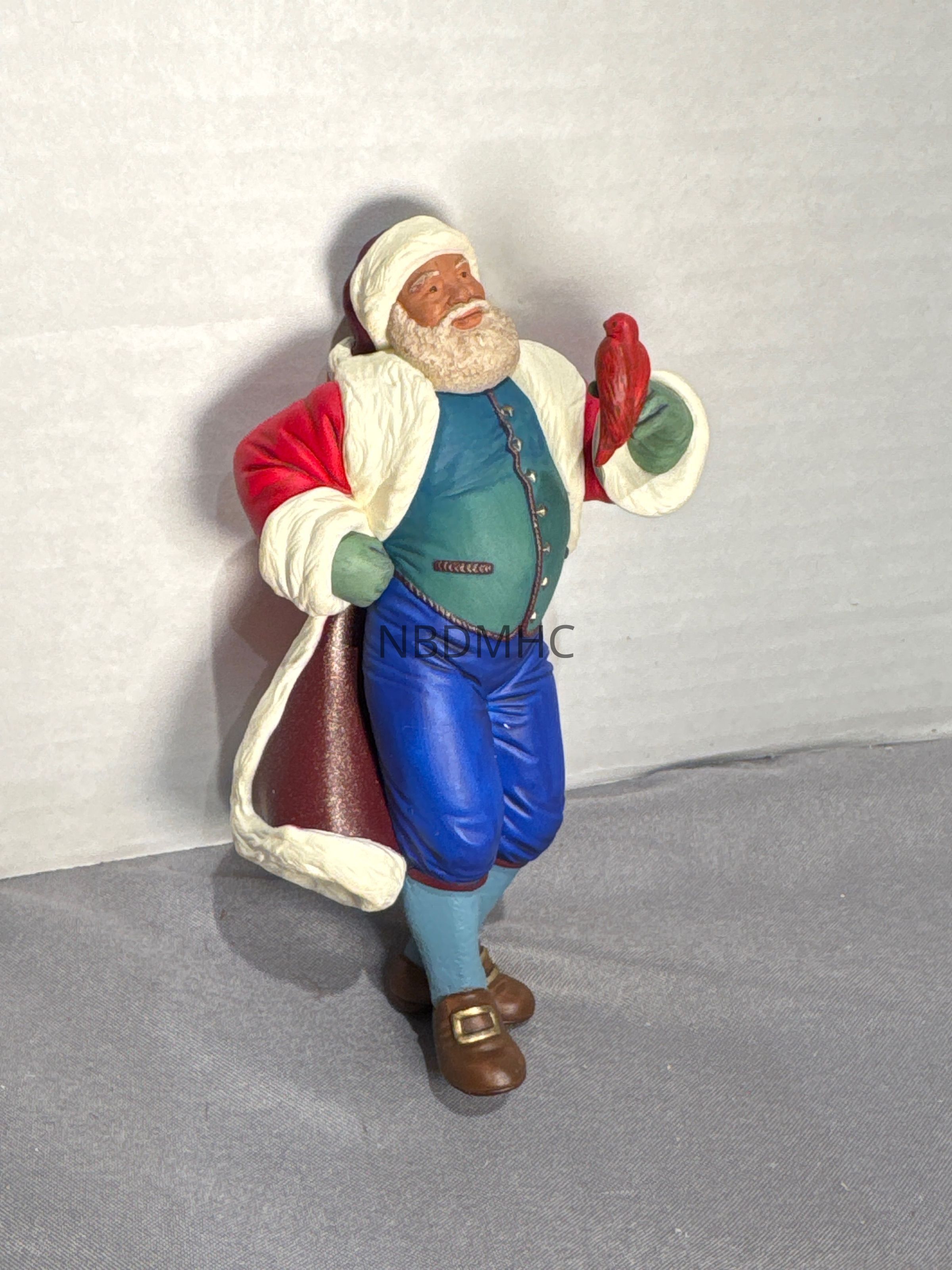 Joyful Santa with blue pants, green gloves, red bird in hand. ornament. Guinness 794