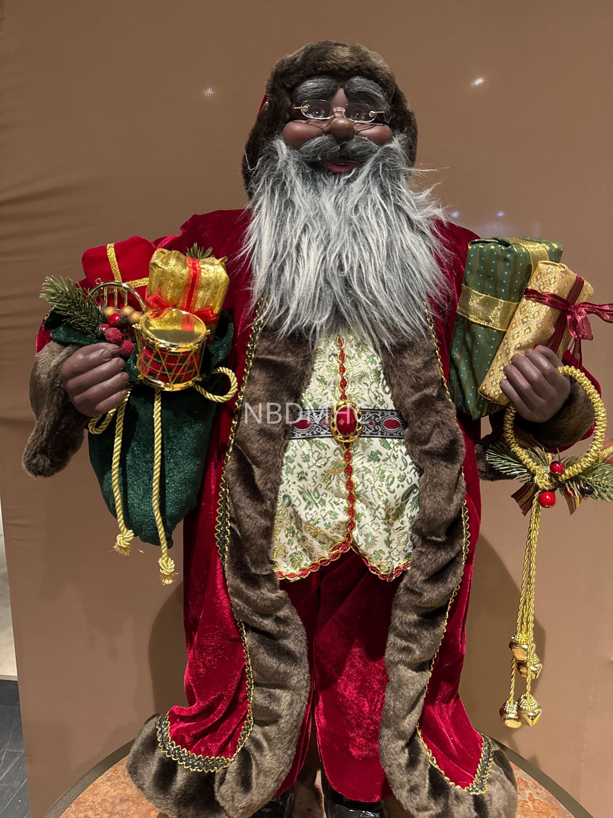 34 inch Santa with red hat and coat trimmed in brown fur and gold braid. Green and white brocade waistcoat has veld with large red stone. Holding a gold circle with dangling bells and gifts in left hand and a green velvet bag with a drum and gifts in right hand. Guinness 676