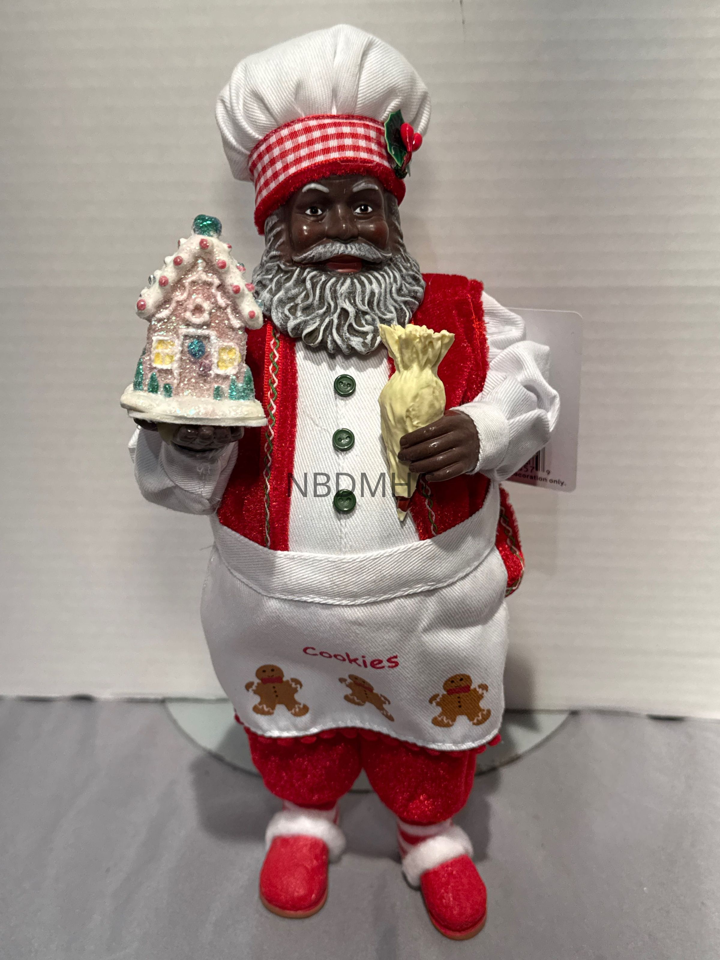 11 inch Santa with red checked band on chef’s hat, green buttons on shirt, apron that says “cookies,” holding pastry tube and gingerbread house. Guinness