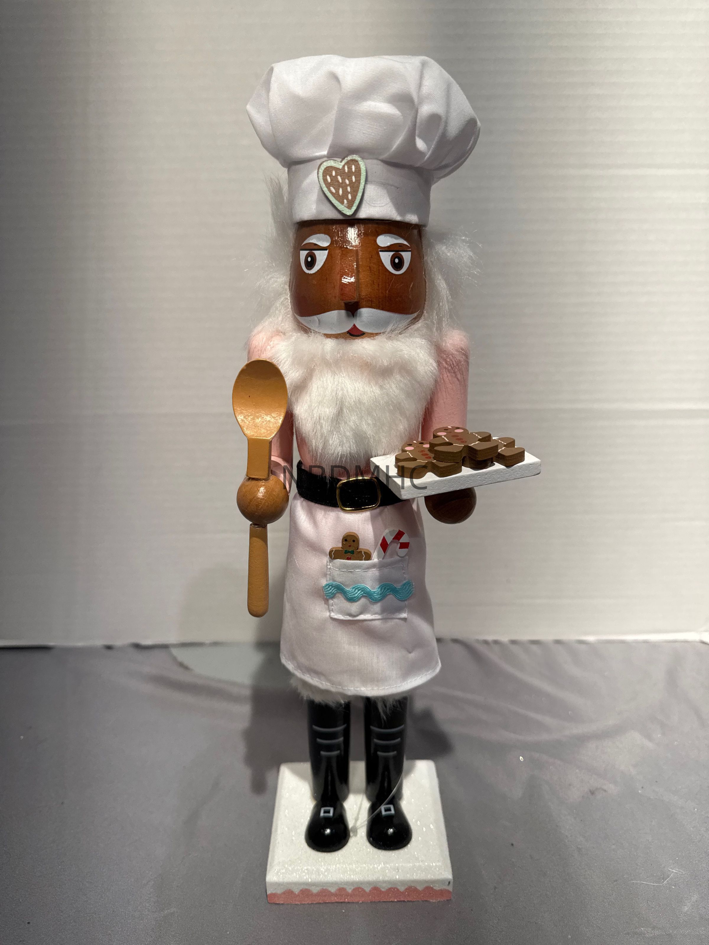 14.5" Chef Nutcracker wearing a pink suit with a black belt and white apron. He's carrying a tray of gingerbread cookies in one hand a wooden spoon in the other. Guinness 860.
