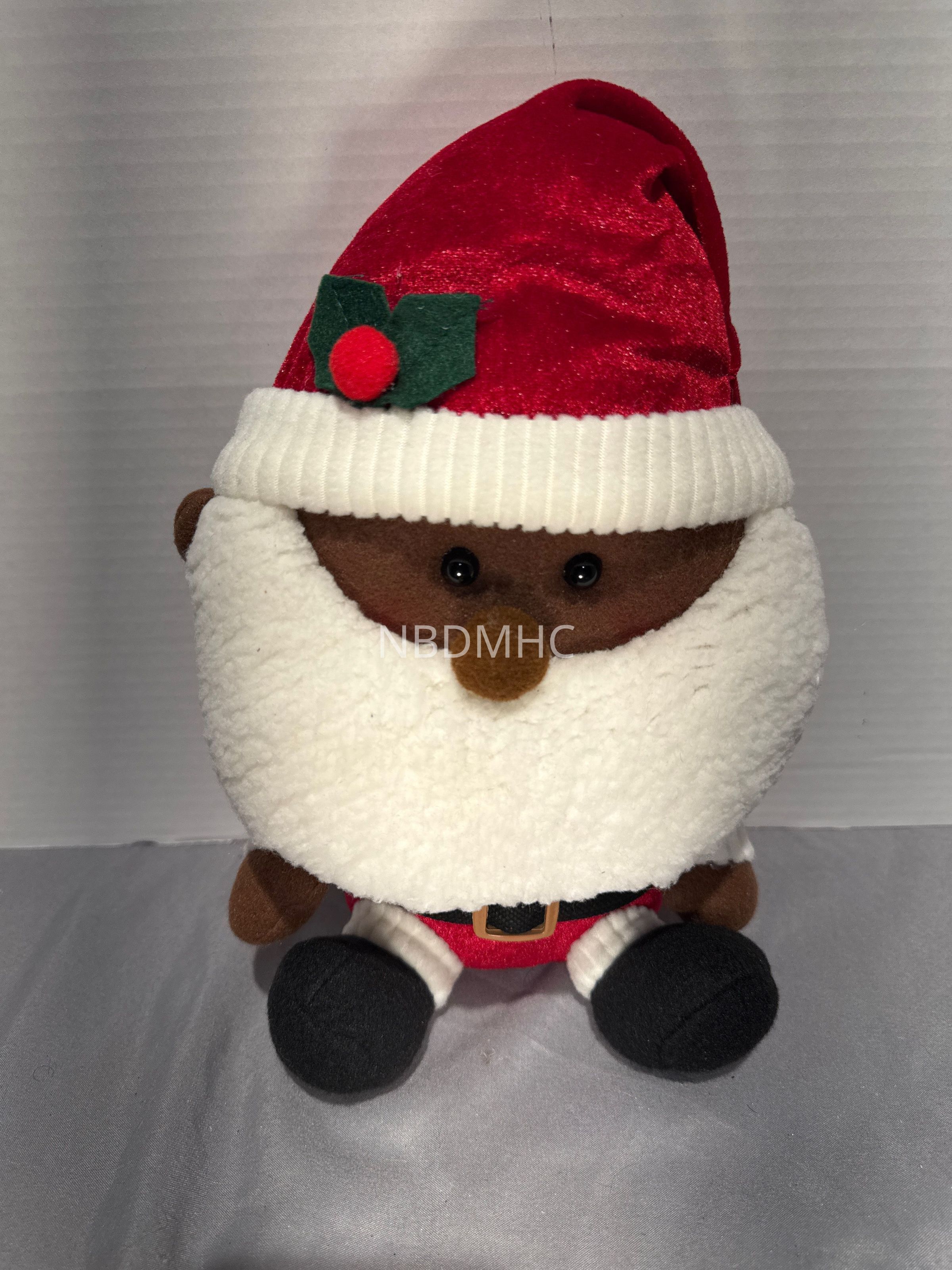 11 inch seated Santa elf made of velour with button eyes, white fleece beard. Holly sprig on hat. Guinness 588.