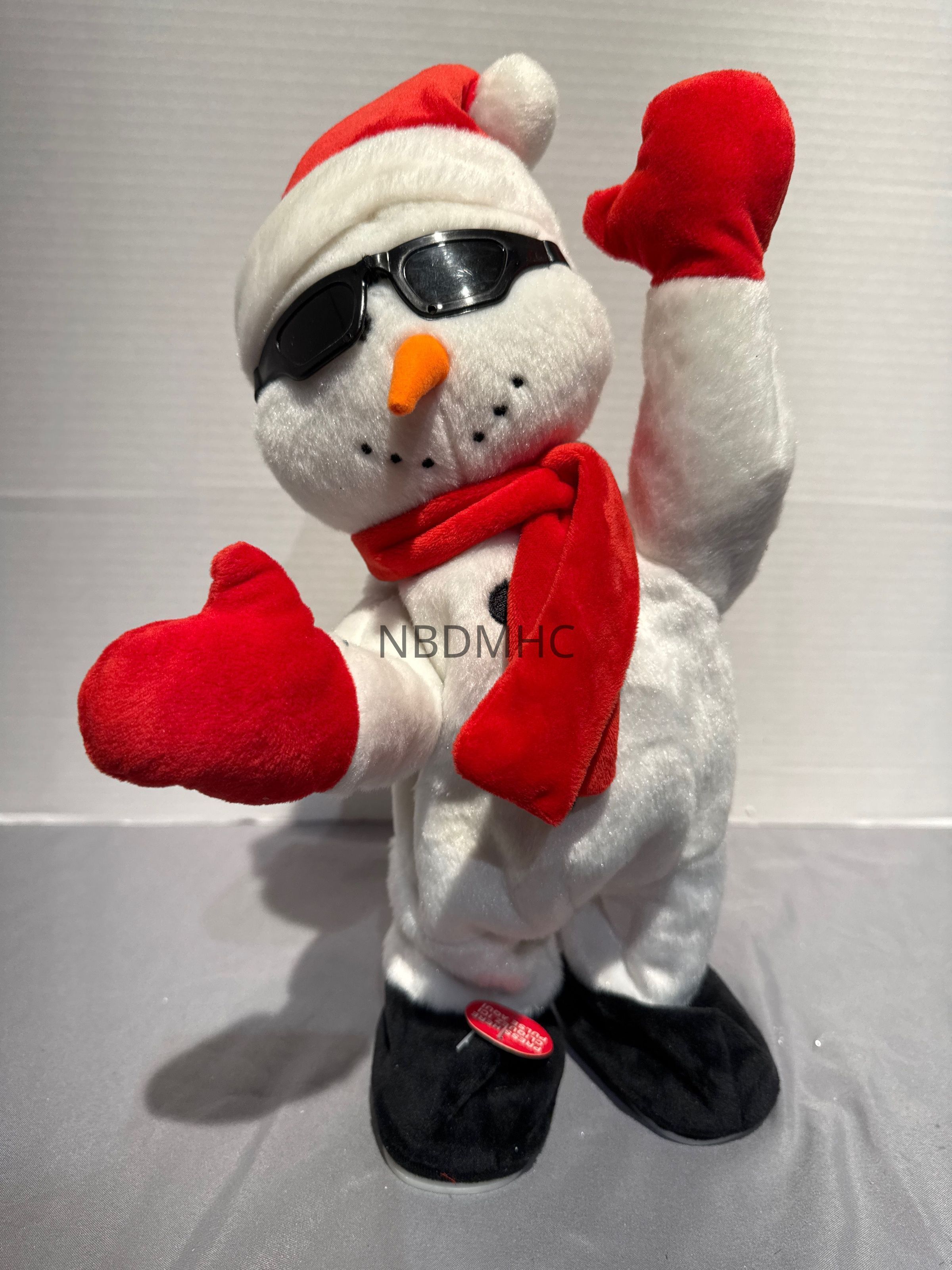 14 inch snowman Santa wearing dark glasses, with carrot nose and coal mouth. Wearing Santa hat, mittens, and red scarf at neck. Black shoes. Mechanical. Guinness 148.