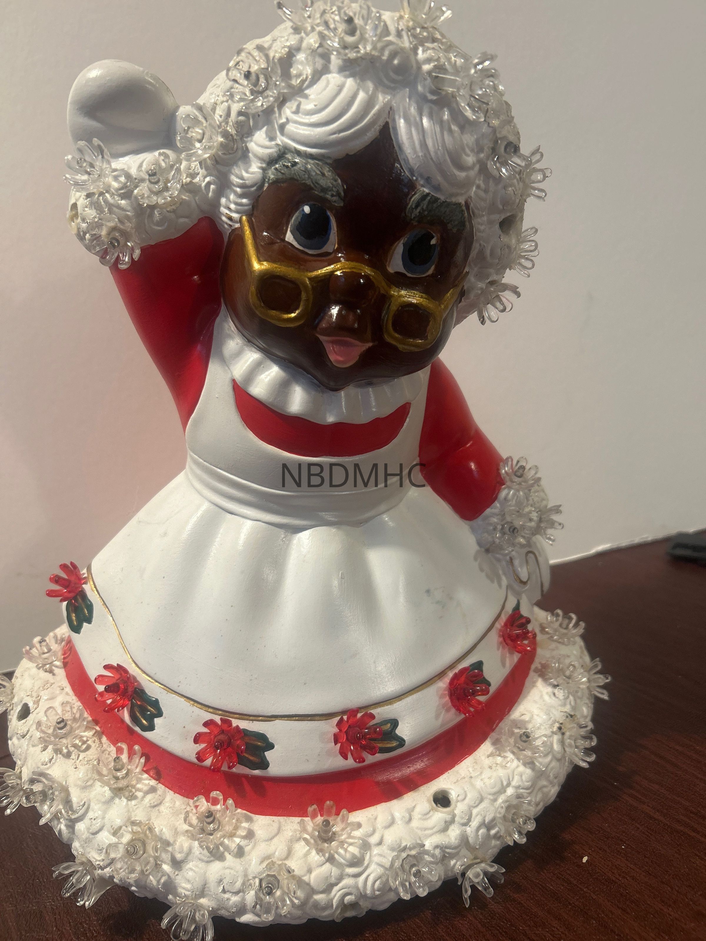13” Ceramic Mrs Claus lights up with red and clear floral petals located throughout dress and hair