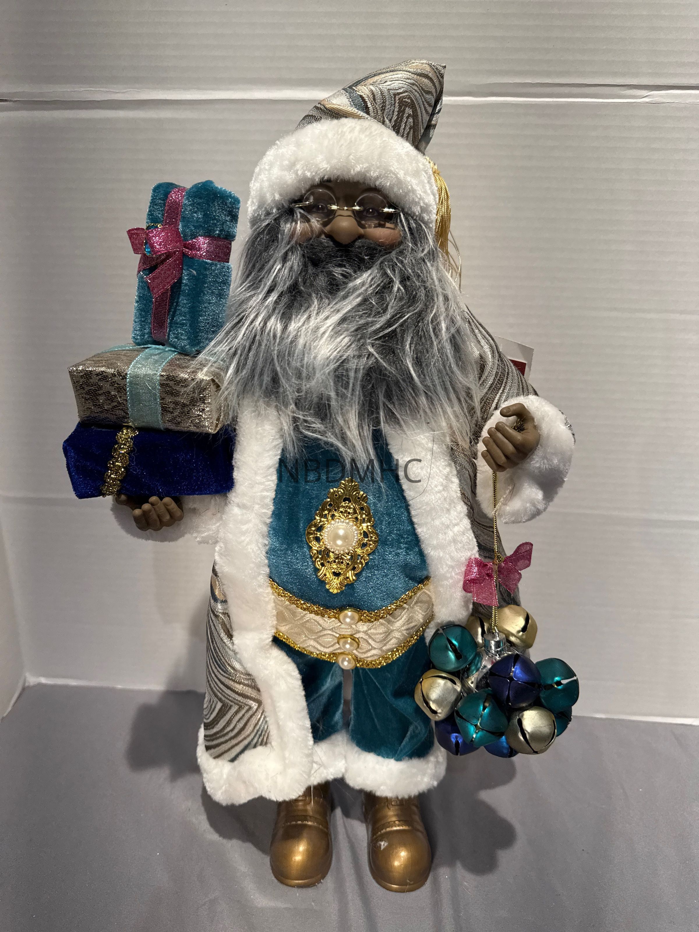 18 inch Santa with gray and white beard, wearing teal velour with pearl buttons, hat and robe are teal, gold, and silver. Holding bells and presents. Guinness 397