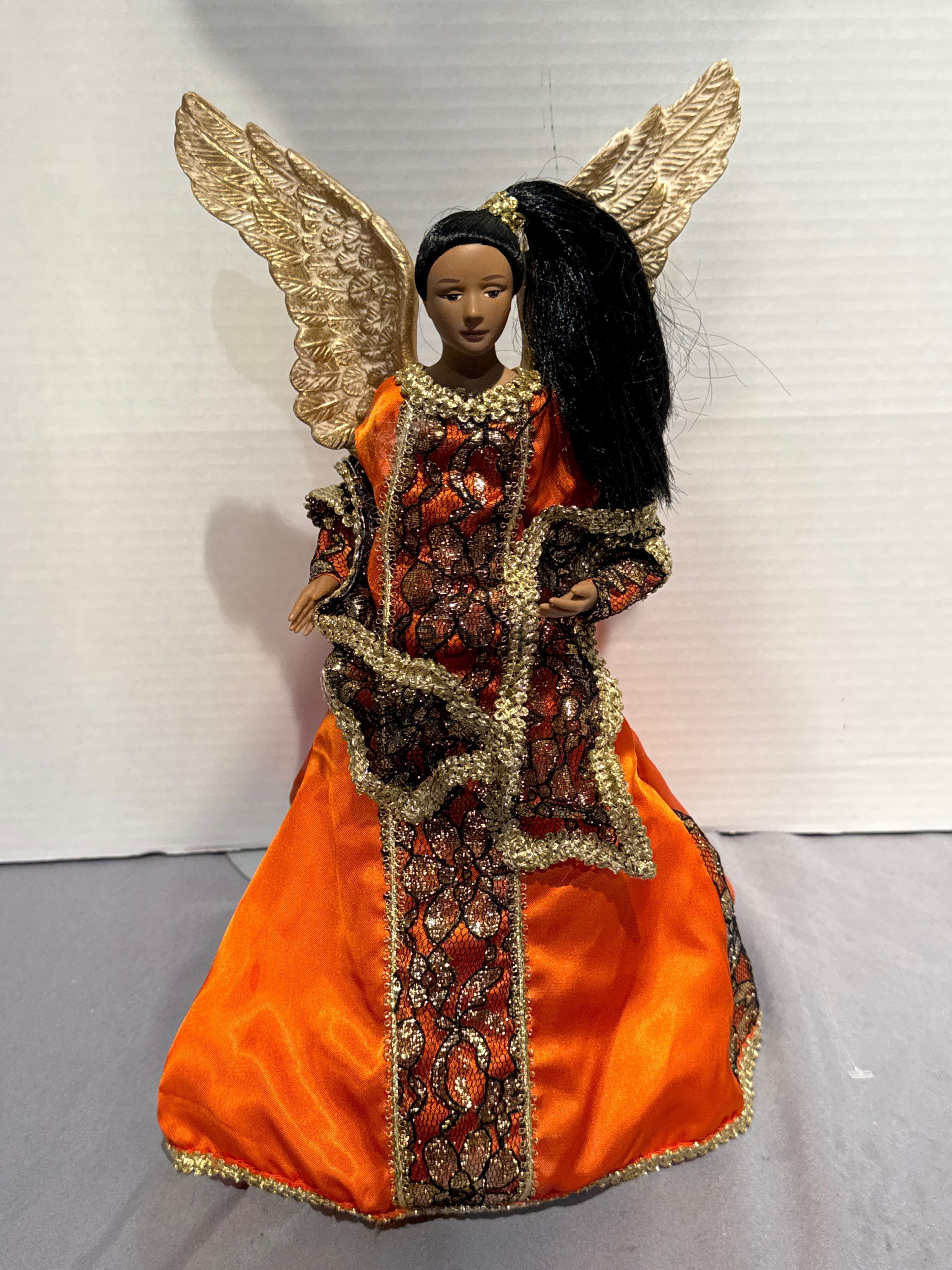 11 1/2 inch treetopper angel with flowing side ponytail, dressed in orange with black and gold lace trim and stole. Gold and white wings. Guinness 708.