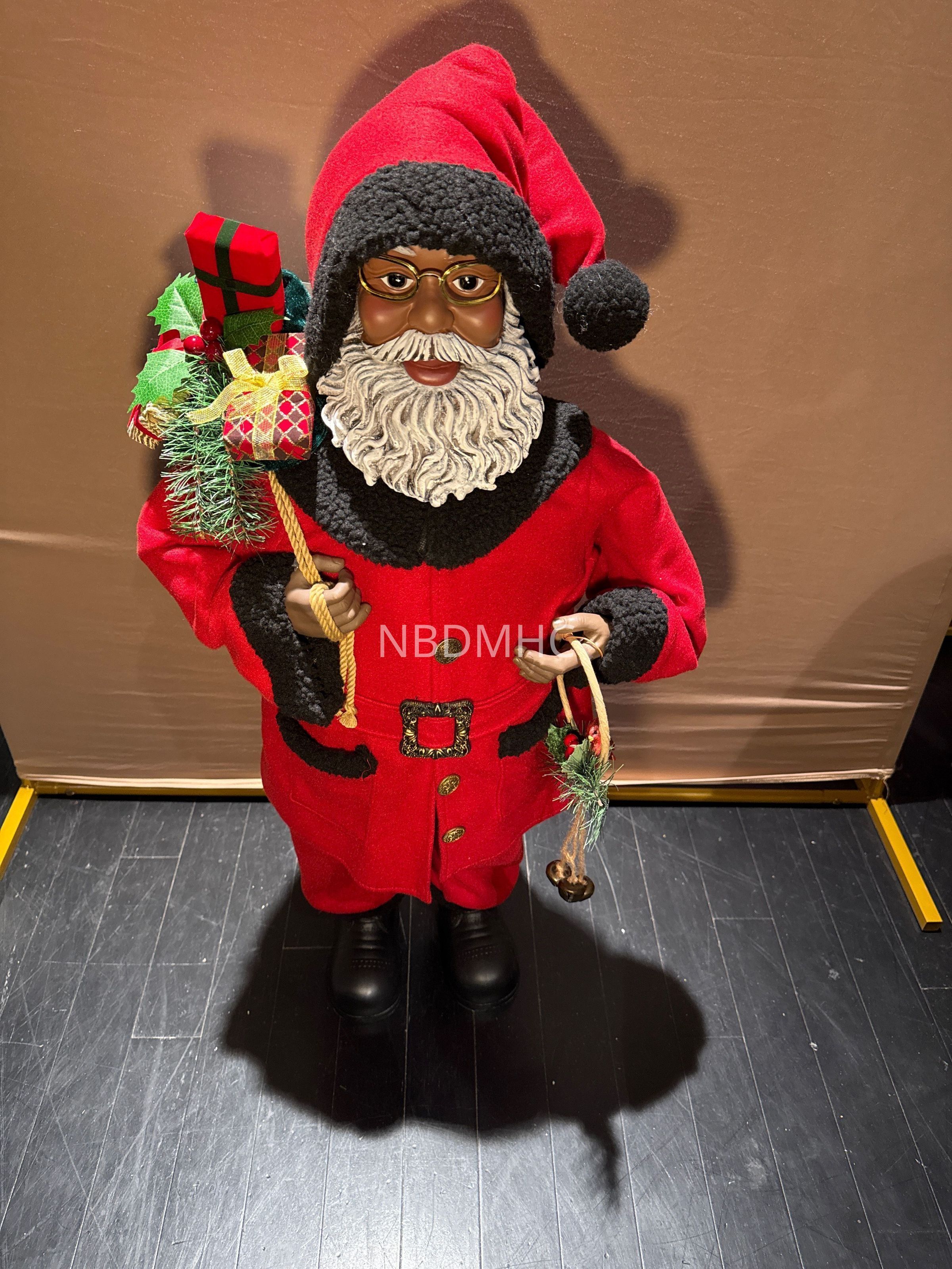 36 inch Santa with black shearling trim on hat and coat, brass buttons and buckle on coat, holding small wreath with cardinal in left hand and rope to green bag of gifts in right hand. Guinness 742.