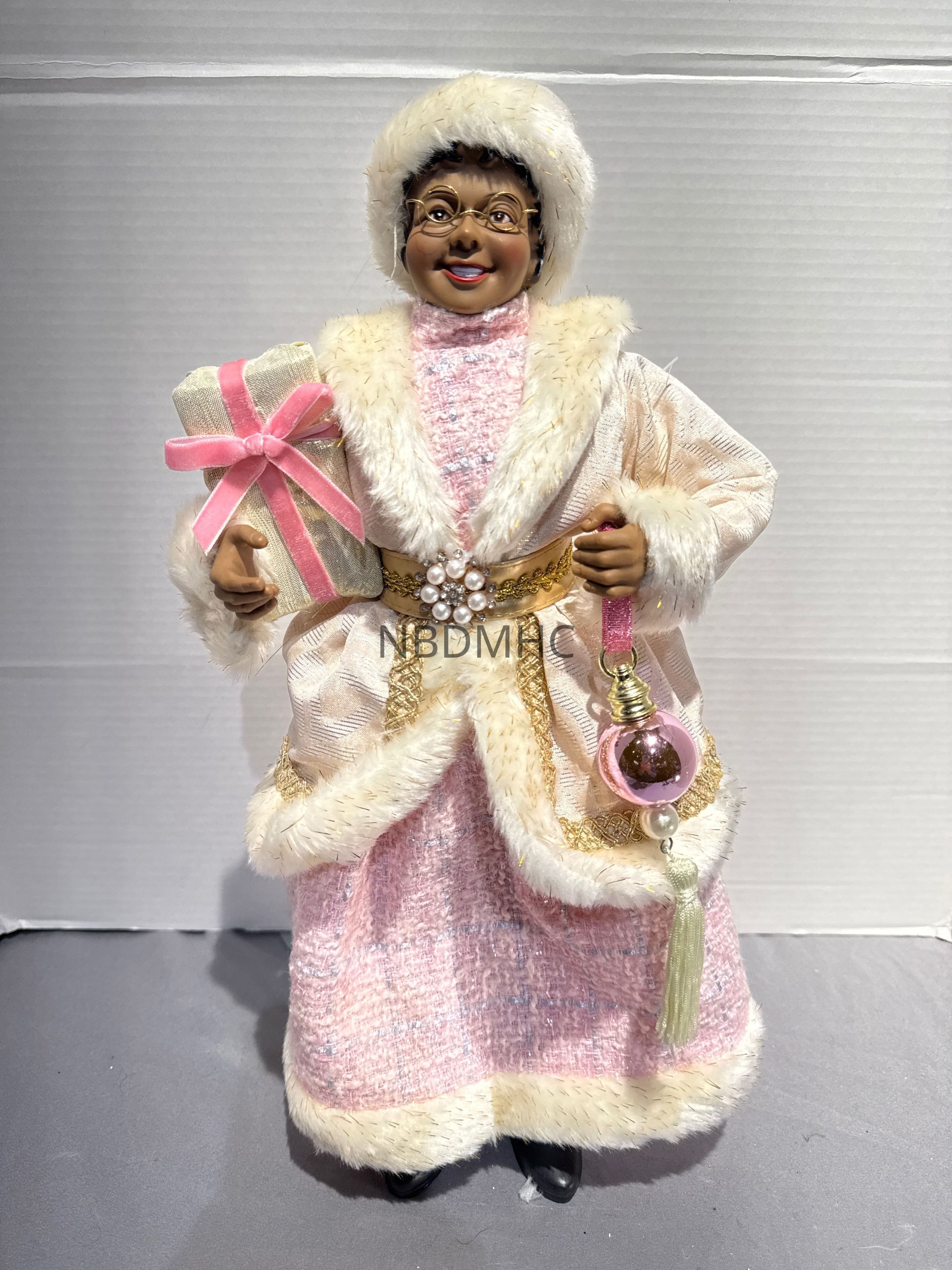 18" Mrs. Claus wearing a pink dress with white and gold faux fir trim. She's also wearing a white jacket with gold ribbon, white and gold faux fir trim, a matching hat and a gold and pearl belt. She carries a present in one hand and a pink and pearl ornament in the other. Guinness 853.