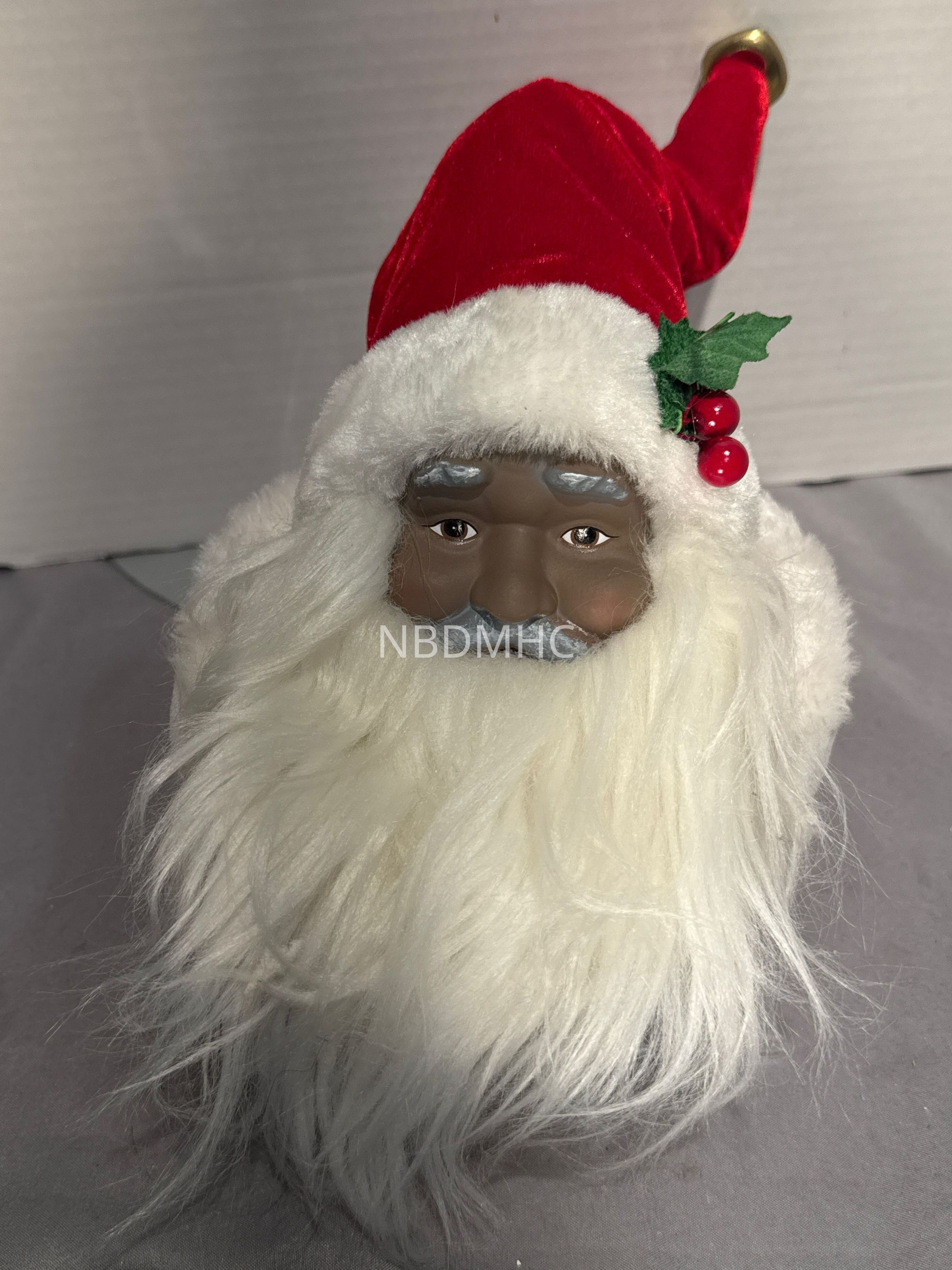 5 inch Santa head with full white beard and holly sprig on hat. On round red base trimmed in white fur. (1 of 2). Guinness 702.