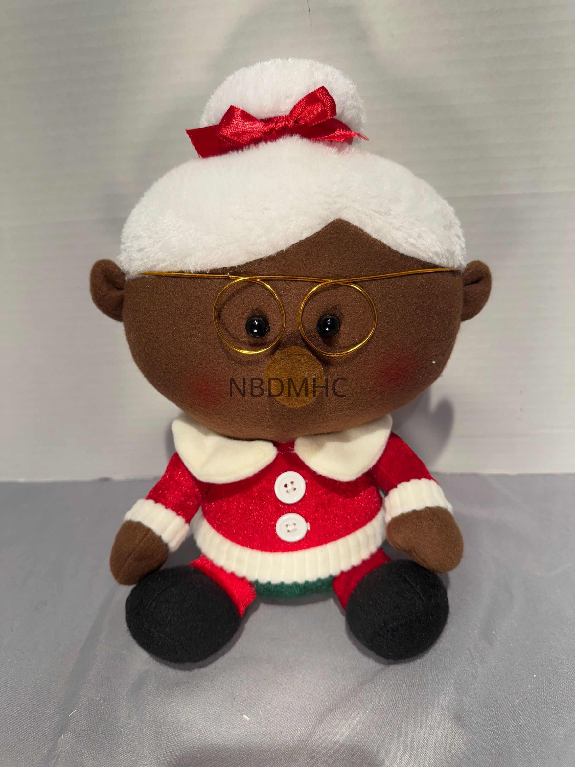 11inch seated Mrs Claus made of velour. Gold rim glasses, red ribbon in hair, white buttons and white collar and cuffs on top. Guinness 589