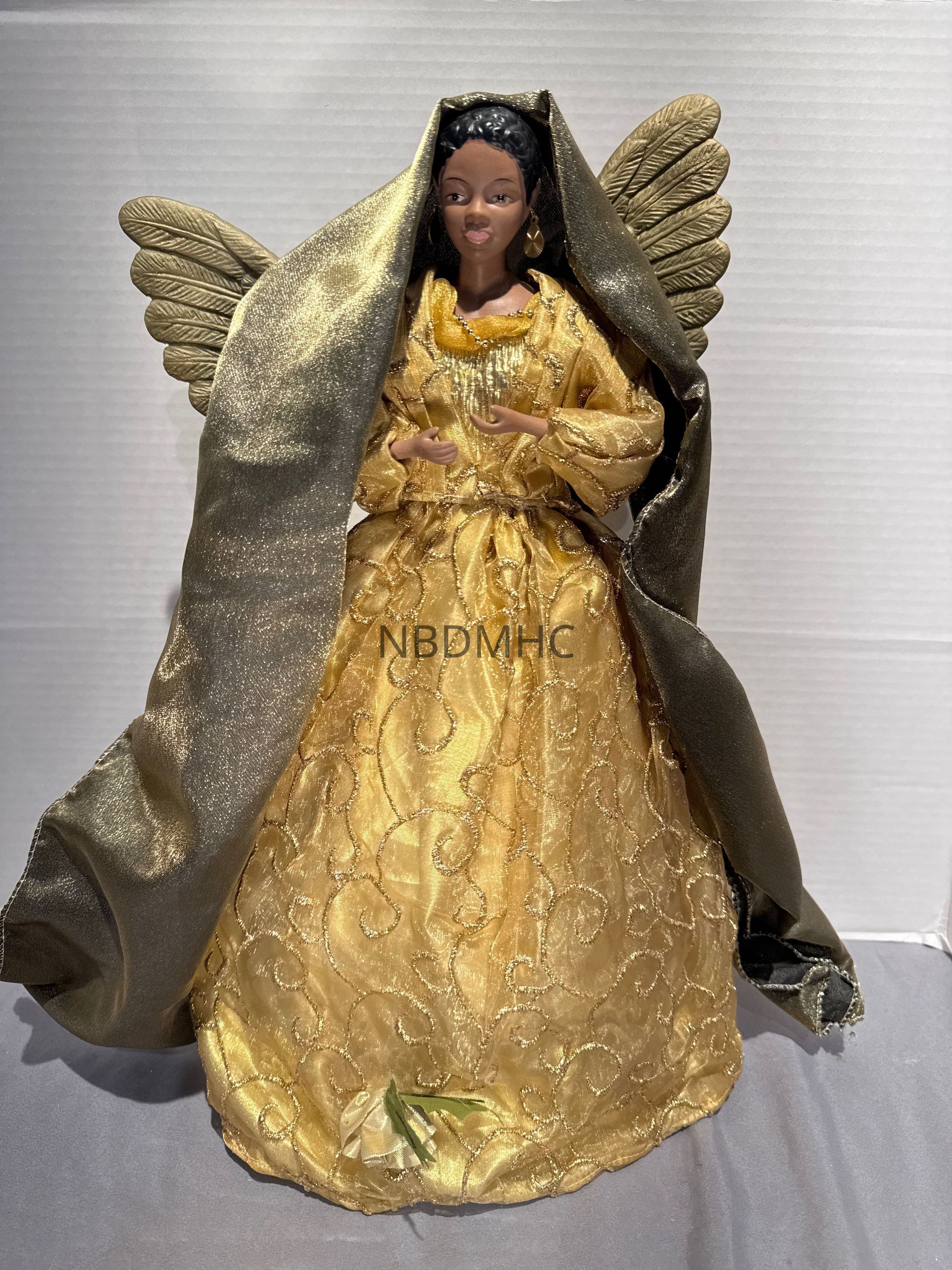 16 inch angel treetopper wearing gold dress, gold earrings, with stole over head of mixed charcoal and gold. Bronze colored wings. Guinness 354