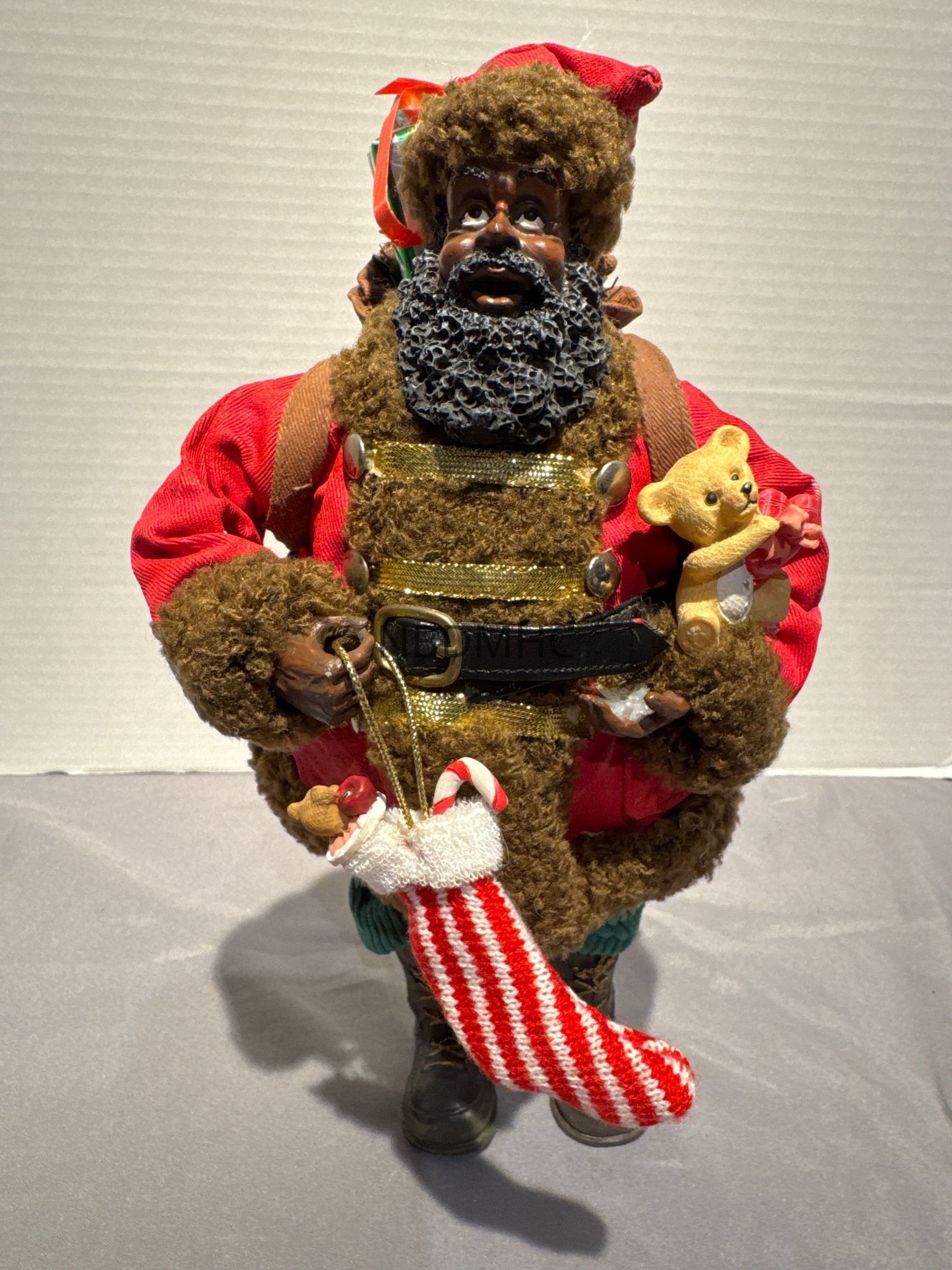 11 inch vinyl Santa in red coat and hat with brown for trim. Presents on back. Holding a teddy bear and a red and white striped Christmas stocking. Guinness 23.