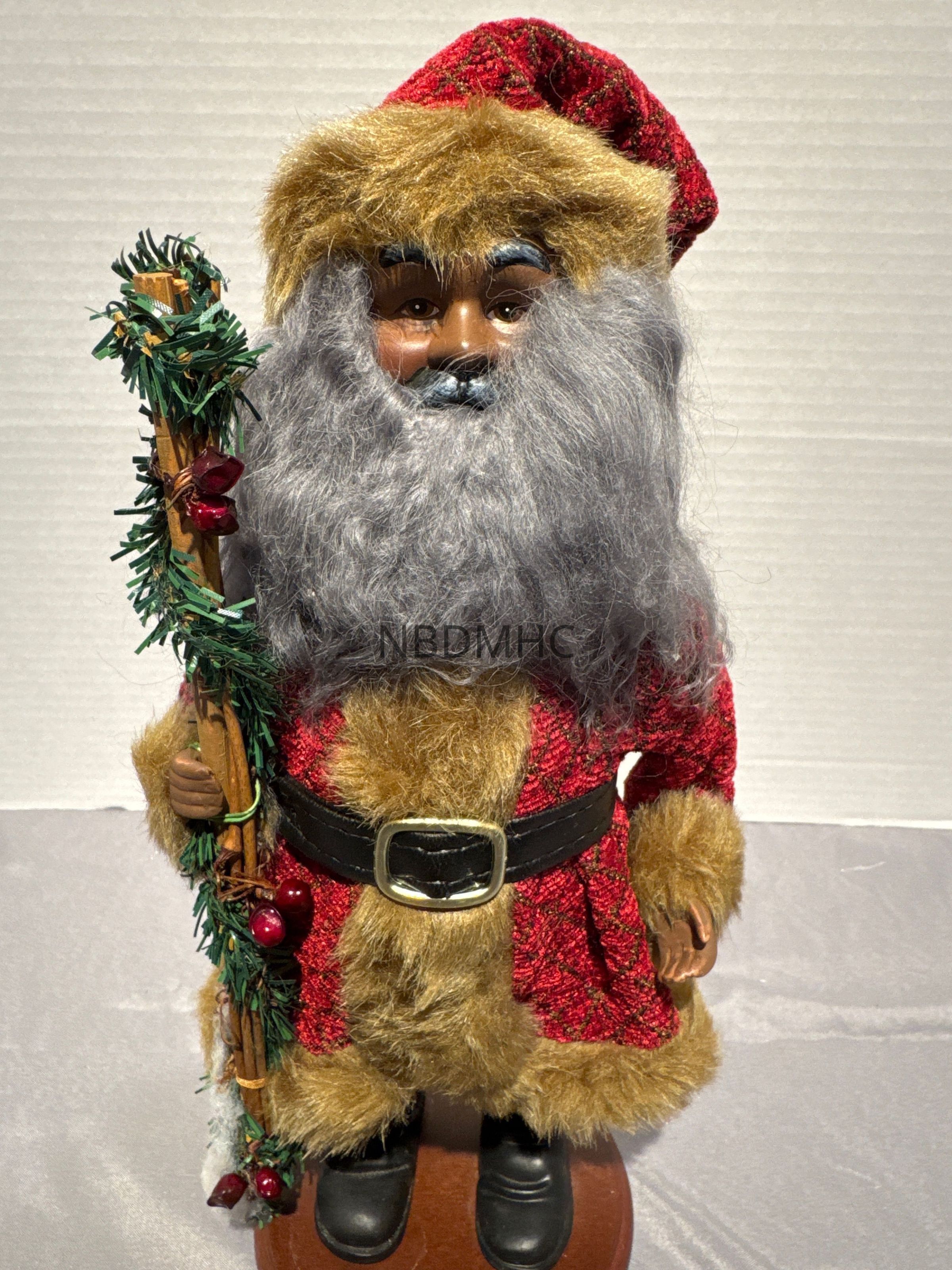 12 inch Santa on wooden stand. Holding staff with greenery and red berries. Brown fur on hat and coat. Guinness 24.