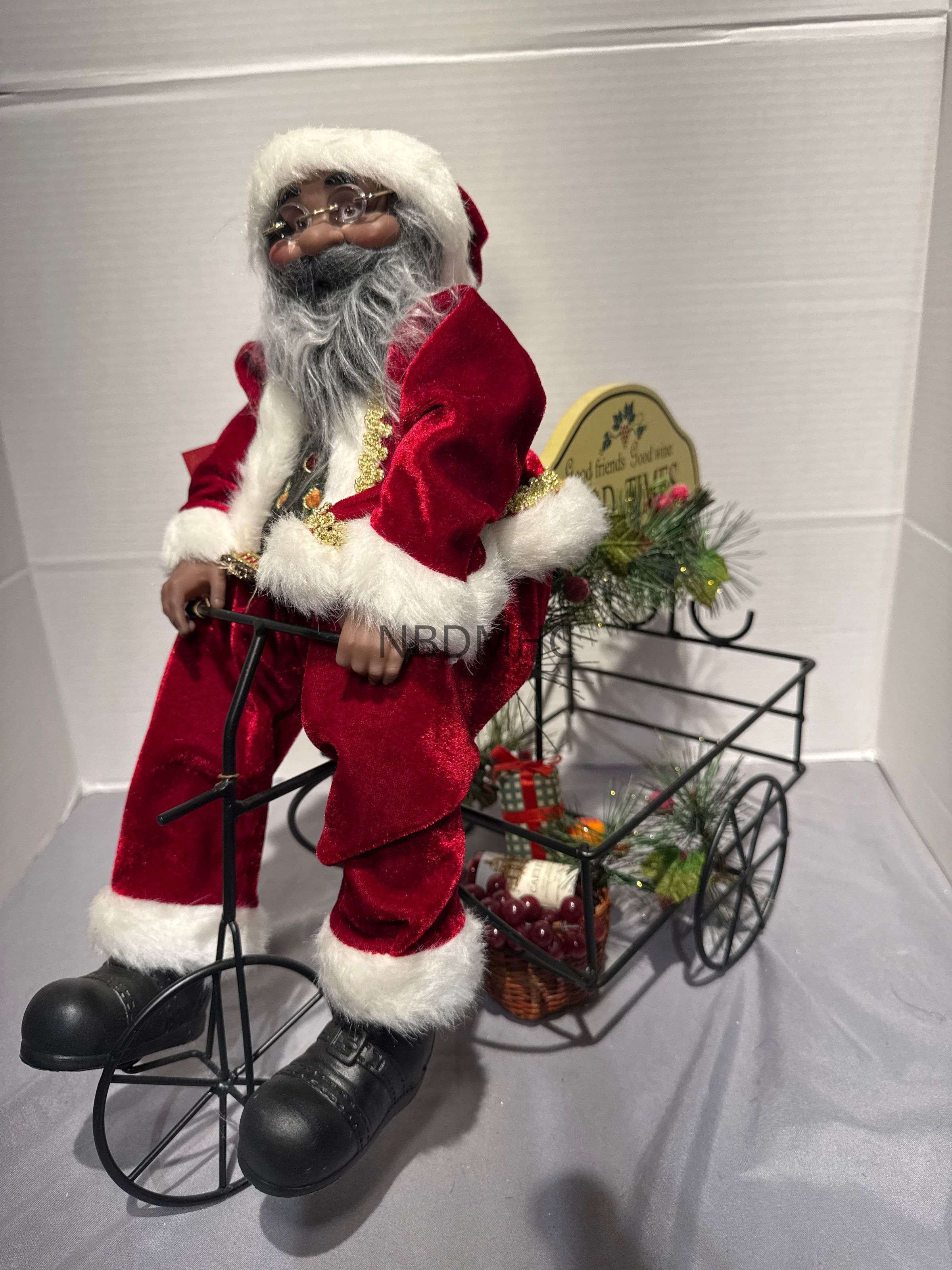 16x17 inch Santa pedaling a black wrought iron cart with a sign that says “Good friends. Good wine.Good Times. Cartcontains greens, wine gift basket, and wrapped gift Guinness 585.