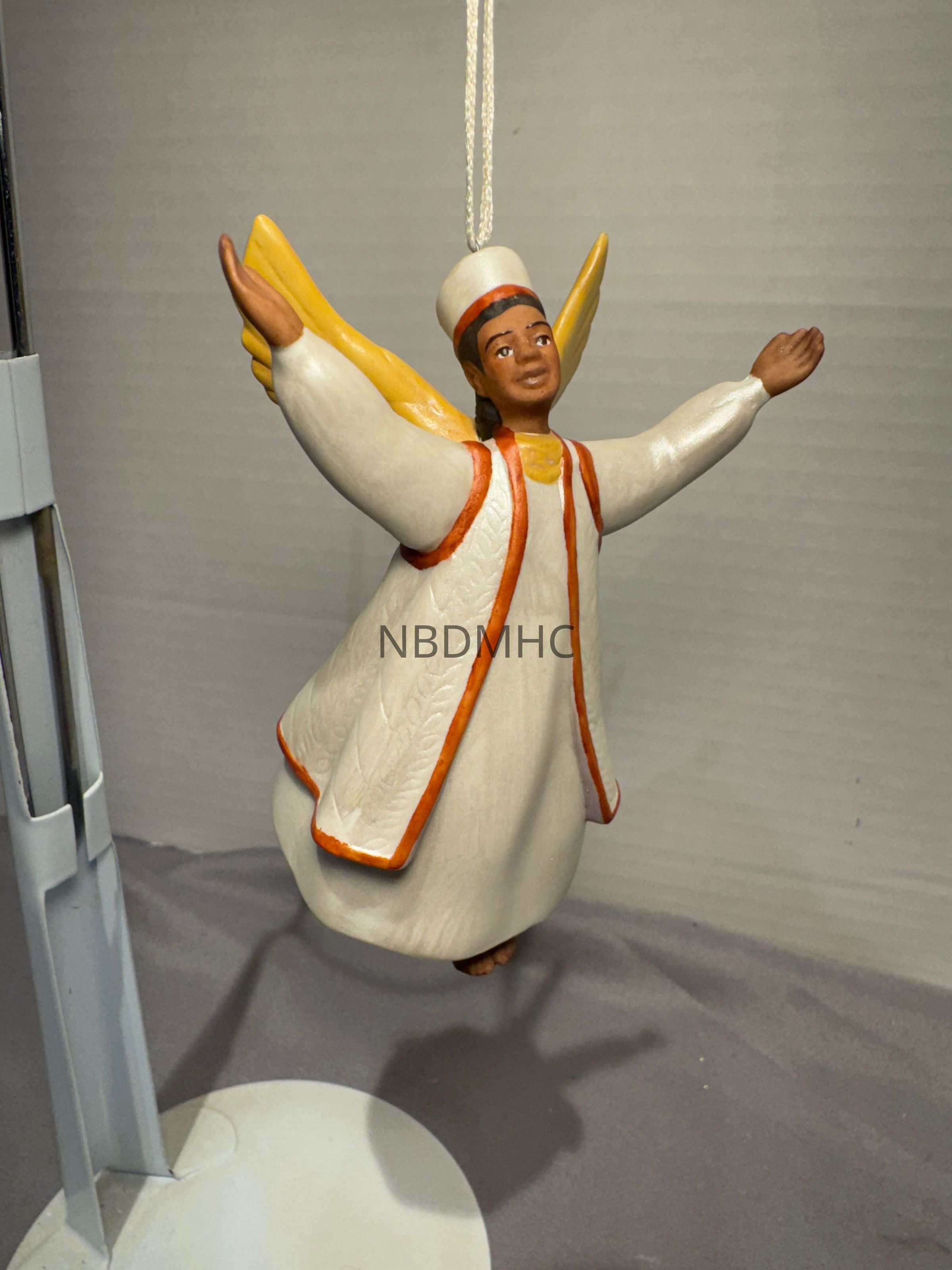 Graceful Angel Bell. Hallmark Keepsake 3 inch angel in white dress with brown trim, gold wings. Guinness 825