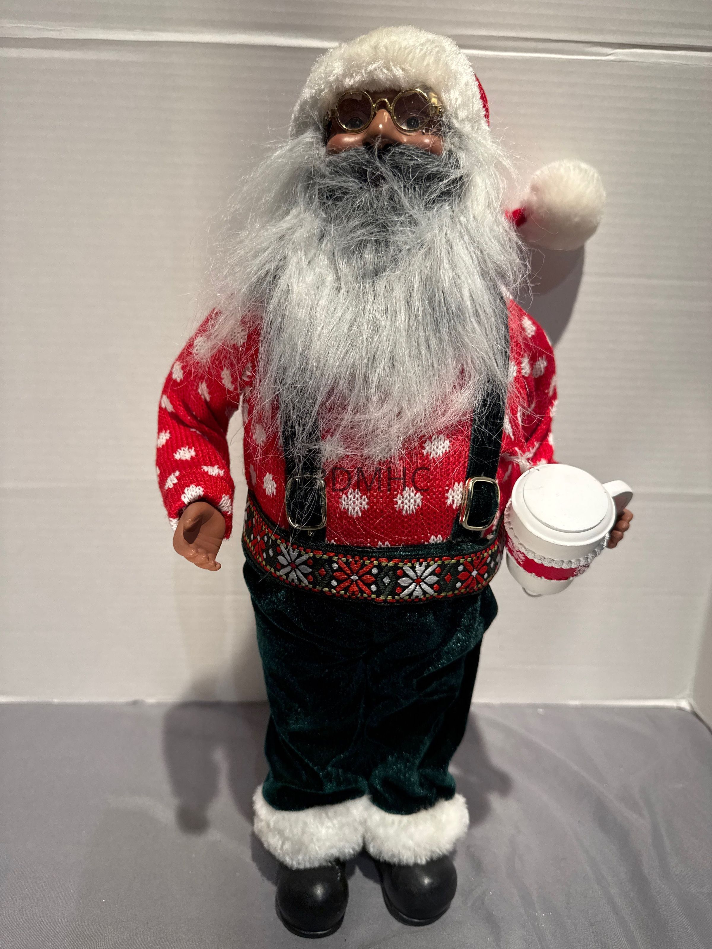 17 1/2 inch vinyl Santa, gray mustache, long white beard, knit shirt is red with white polka dots, green velour pants with suspenders, embroidered belt. Holding mug. Guinness 374