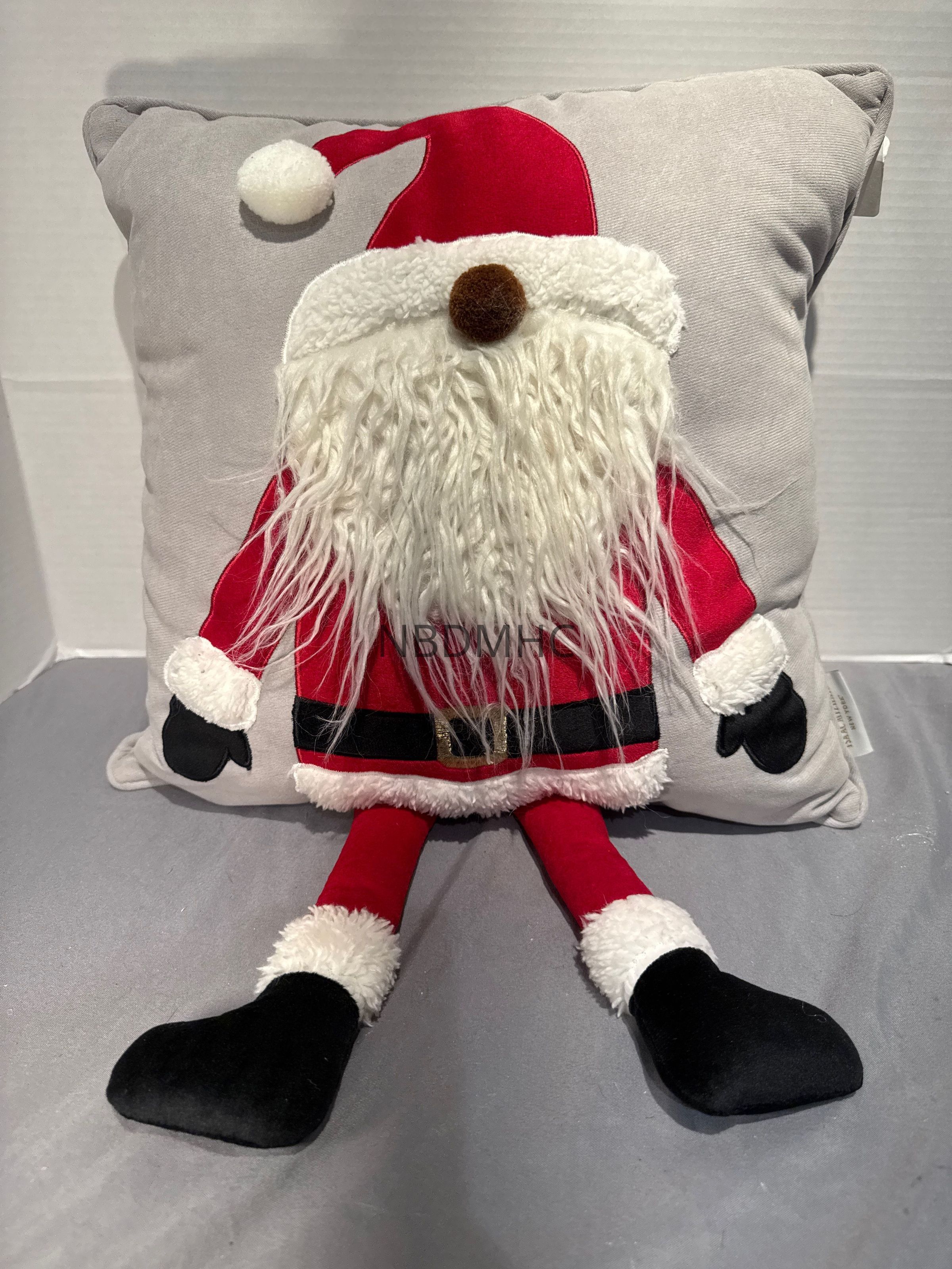 14 inch (not counting legs) Santa pillow. Square gray pillow has Santa appliqué plus legs, extending from pillow. Sarah has white beard,, round brown nose, no other part of face is seen. Guinness 637.