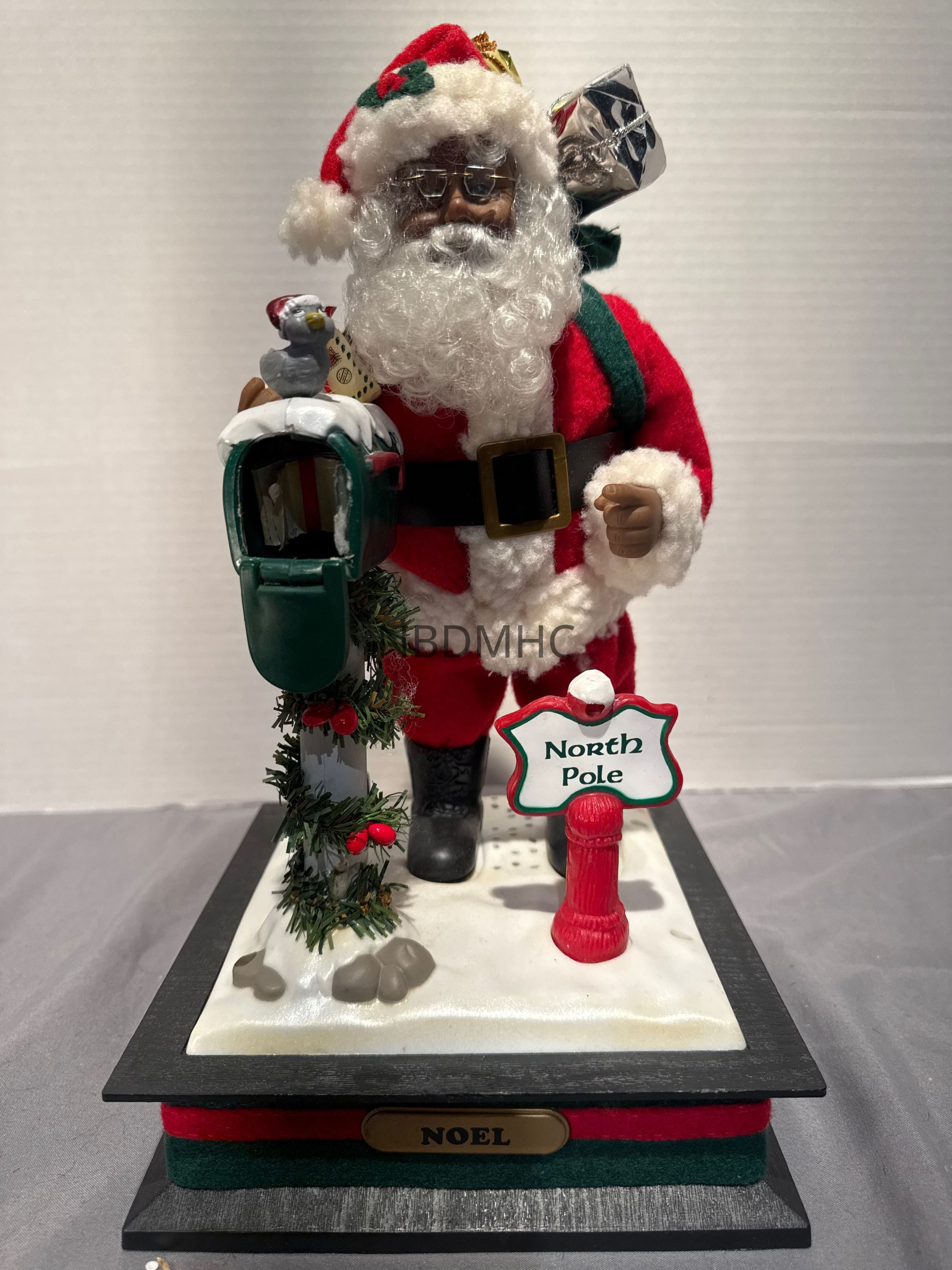 10 inch mechanical Santa with green mailbox and north Pole sign. Presents on back.. Guinness 94