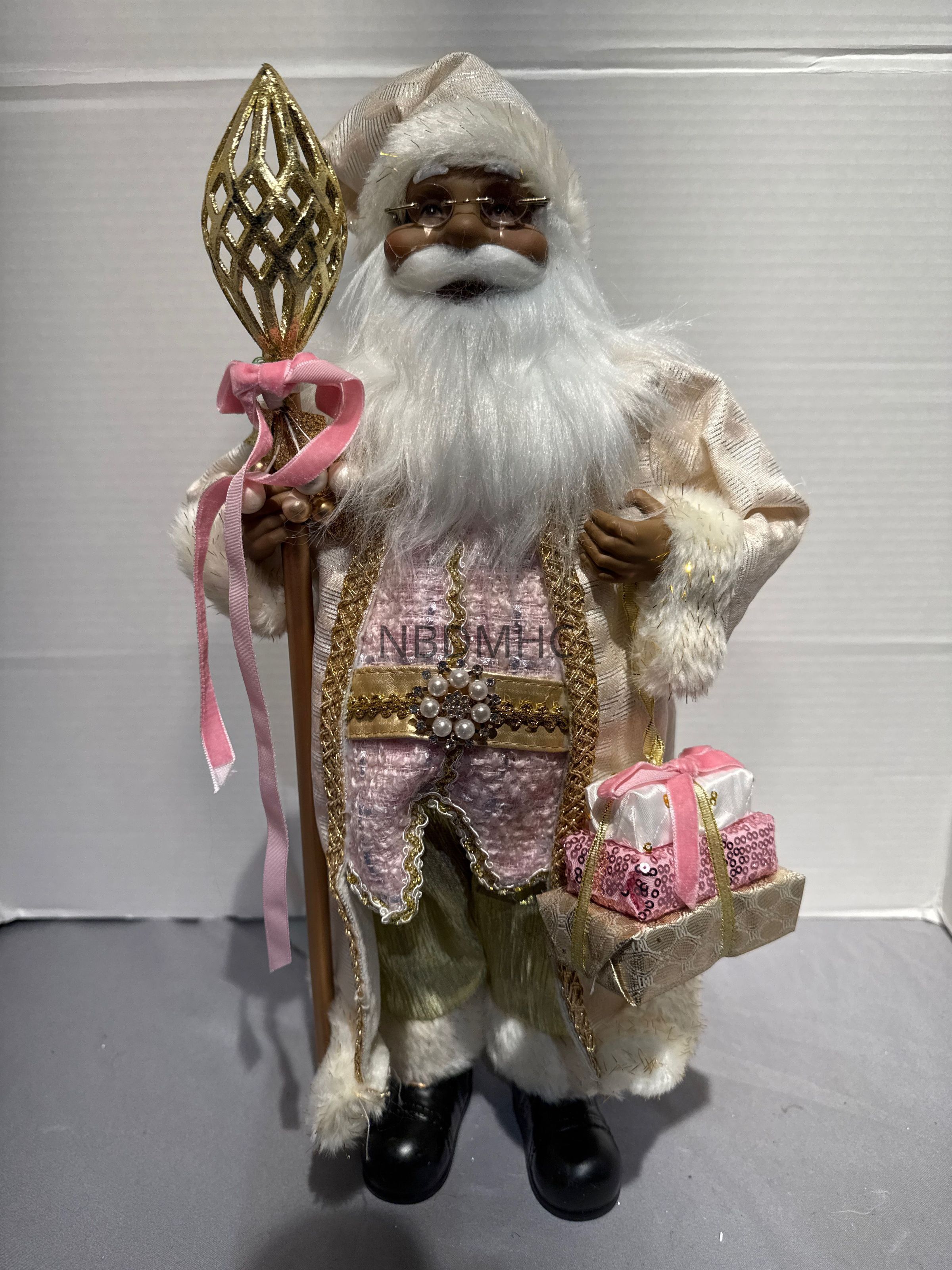 18” Santa. Dressed in pink and gold. Holding 3 boxes in left hand and gold staff in right. All white beard. Guinness 836
