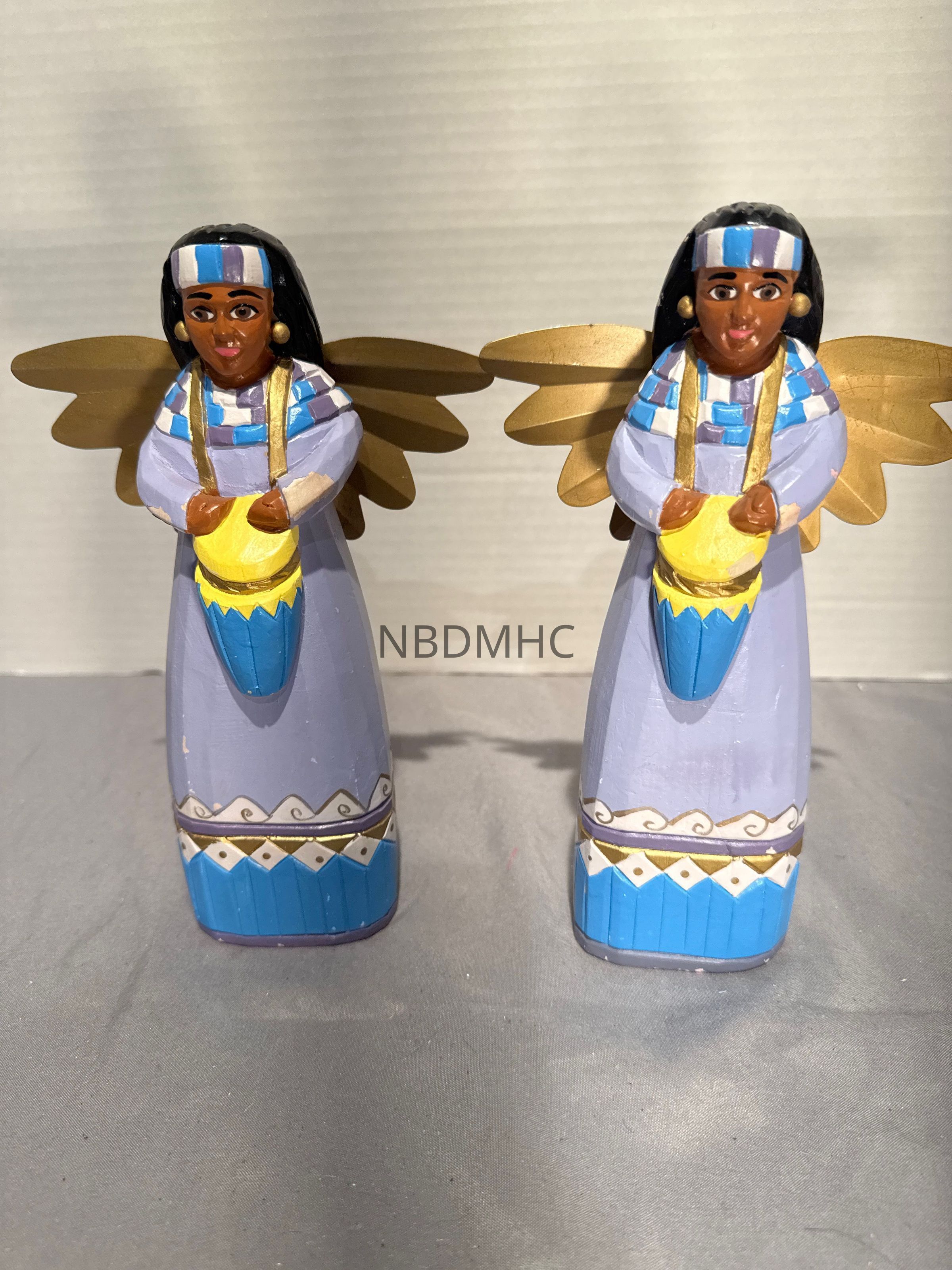 8 inch wooden Native American angels. Lavender and blue dress with blue and yellow drums. Guinness 254