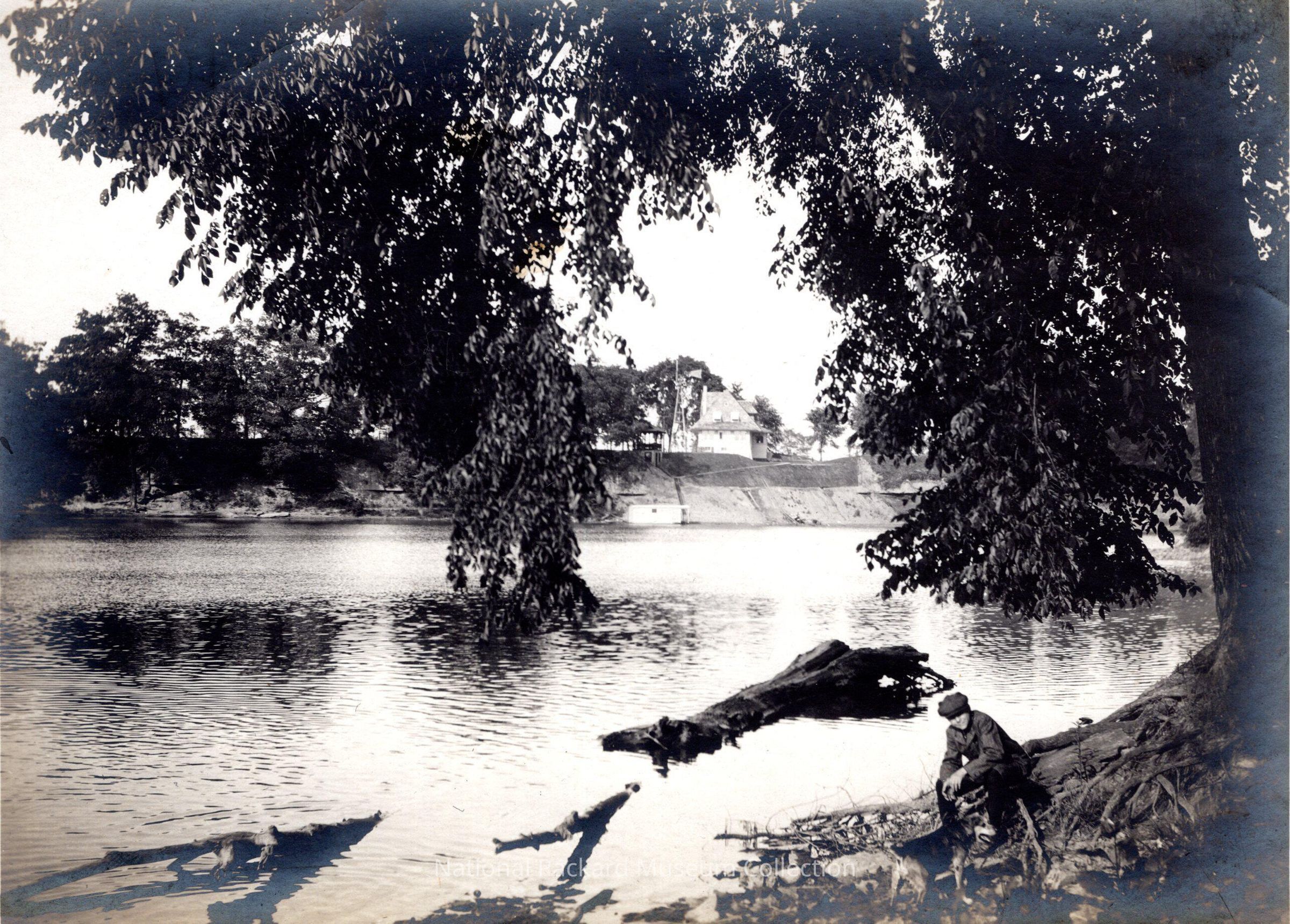 View of Riverscourt, built by W.D. Packard, from a crossed the river; there is a boy and dog in the bottom right