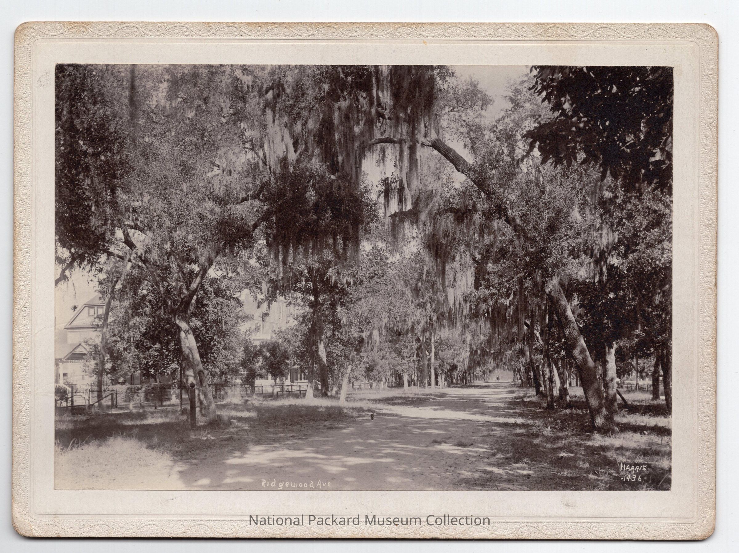 Ridgewood Avenue and hotel. View of walkway and trees. "Ridgewood Ave" and "Harris 1436" written in white on lower middle and right side of image, pres. by photographer. On back, written in pen "This large building at the left is our Hotel--and the avenue looks just as you see it in the picture."Collection