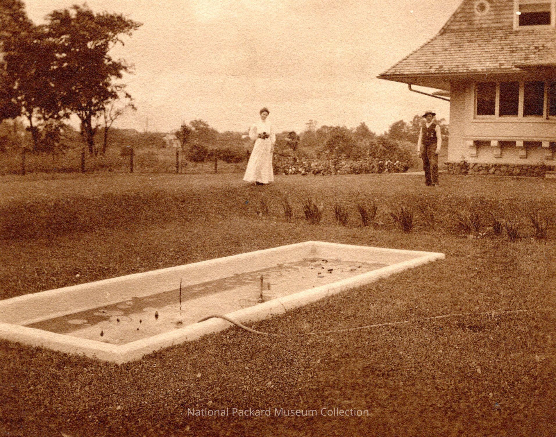 Two unknown people standing near manmade pond at Riverscourt, built by W.D. Packard