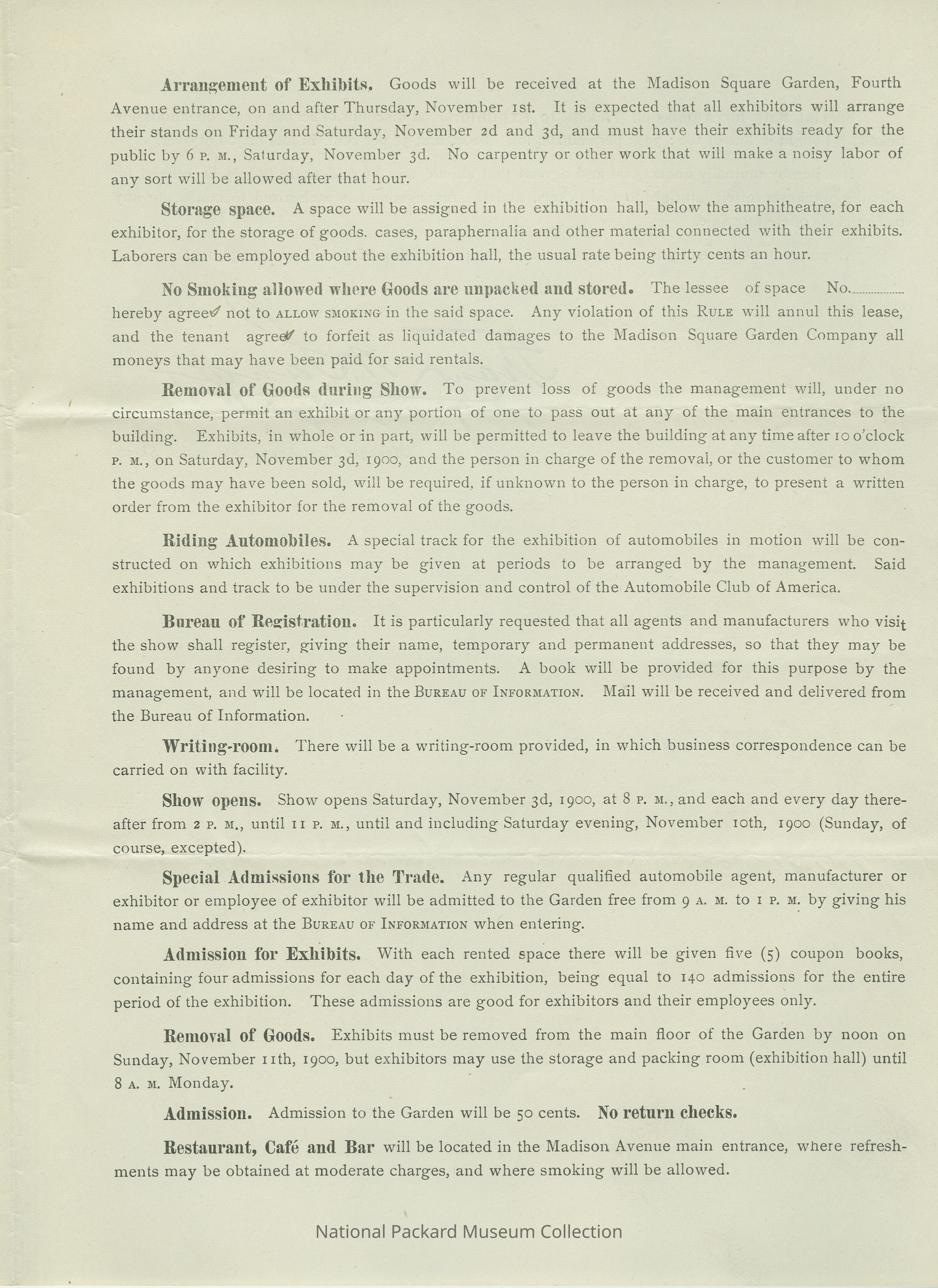 Second page of the rules and regulations for entry into the first Annual Automobile Show at Madison Square Garden in NYC in 1900Collection