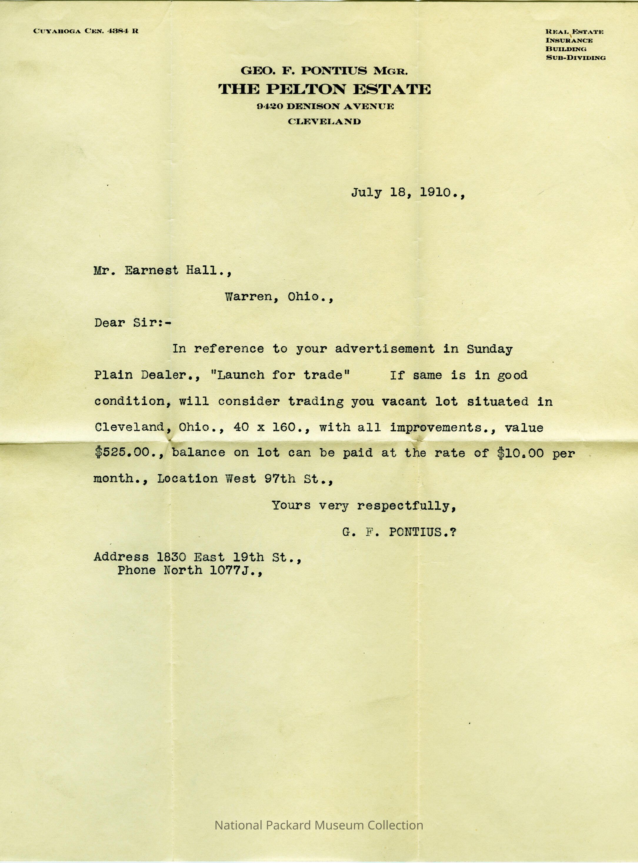 G.F. Pontius responding to an ad placed in the Plain Dealer newspaper by Ernest Hall in which Hall states he has a "Launch for trade." Pontius proposes trading the launch for a vacan lot in Cleveland.Collection