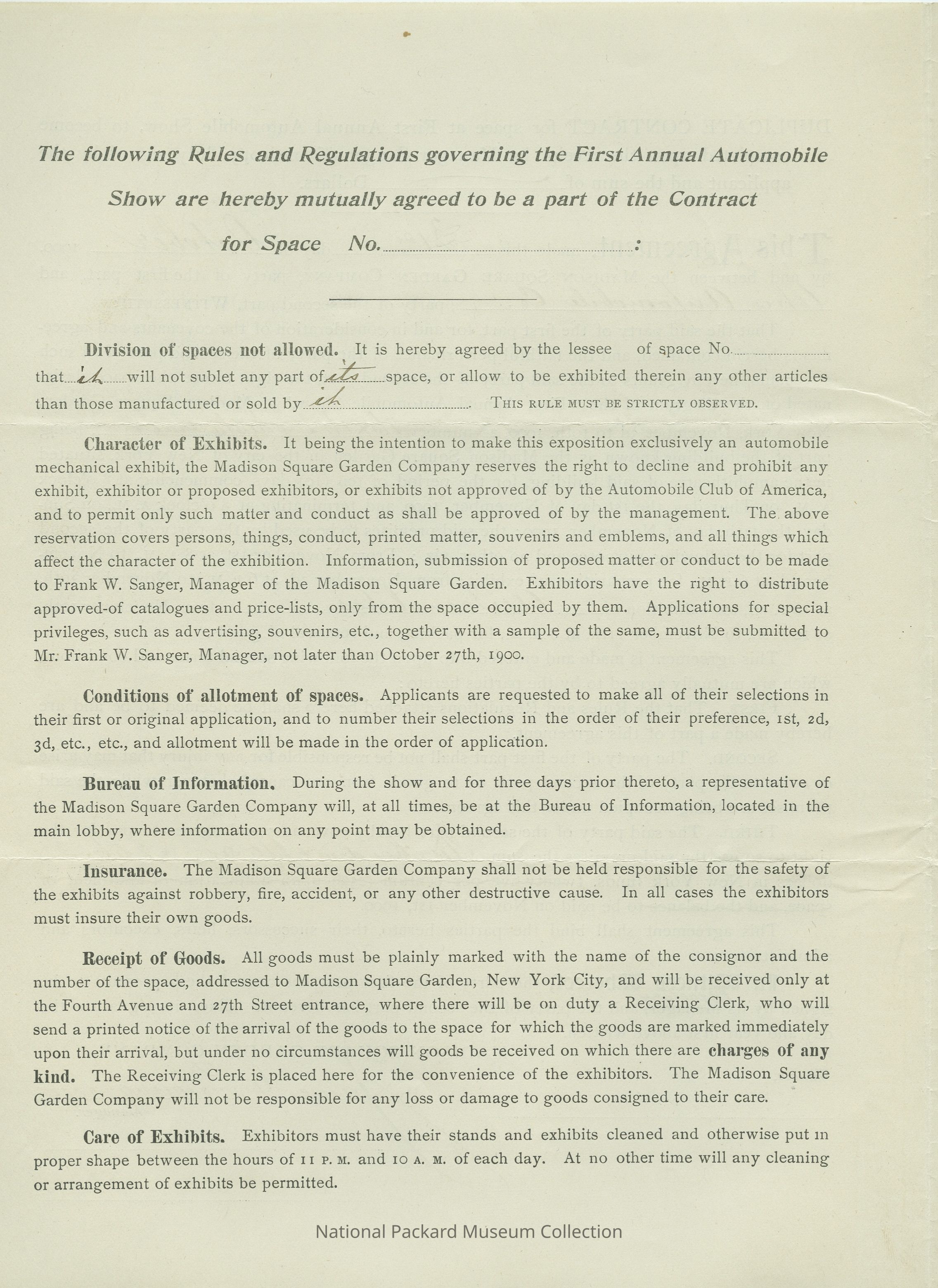 document describing the rules and regulations governing the First Annual Automobile show at Madison Square Gardens in NYCCollection
