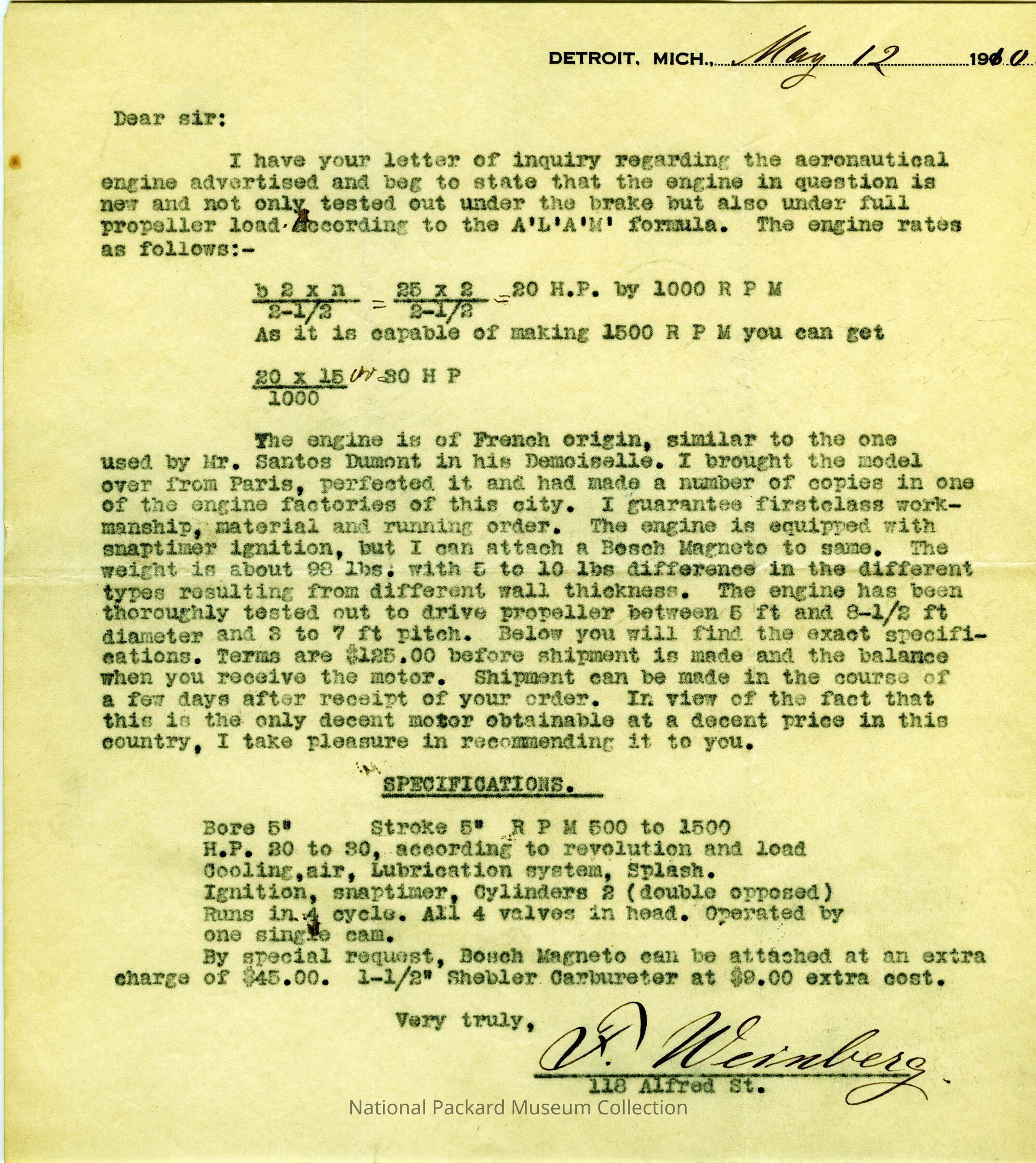 Letter Letter includes details and specifications of an aeronautical engine of French design; includes the A'L'A'M' forumla for the engine Signed by F. Weinberg