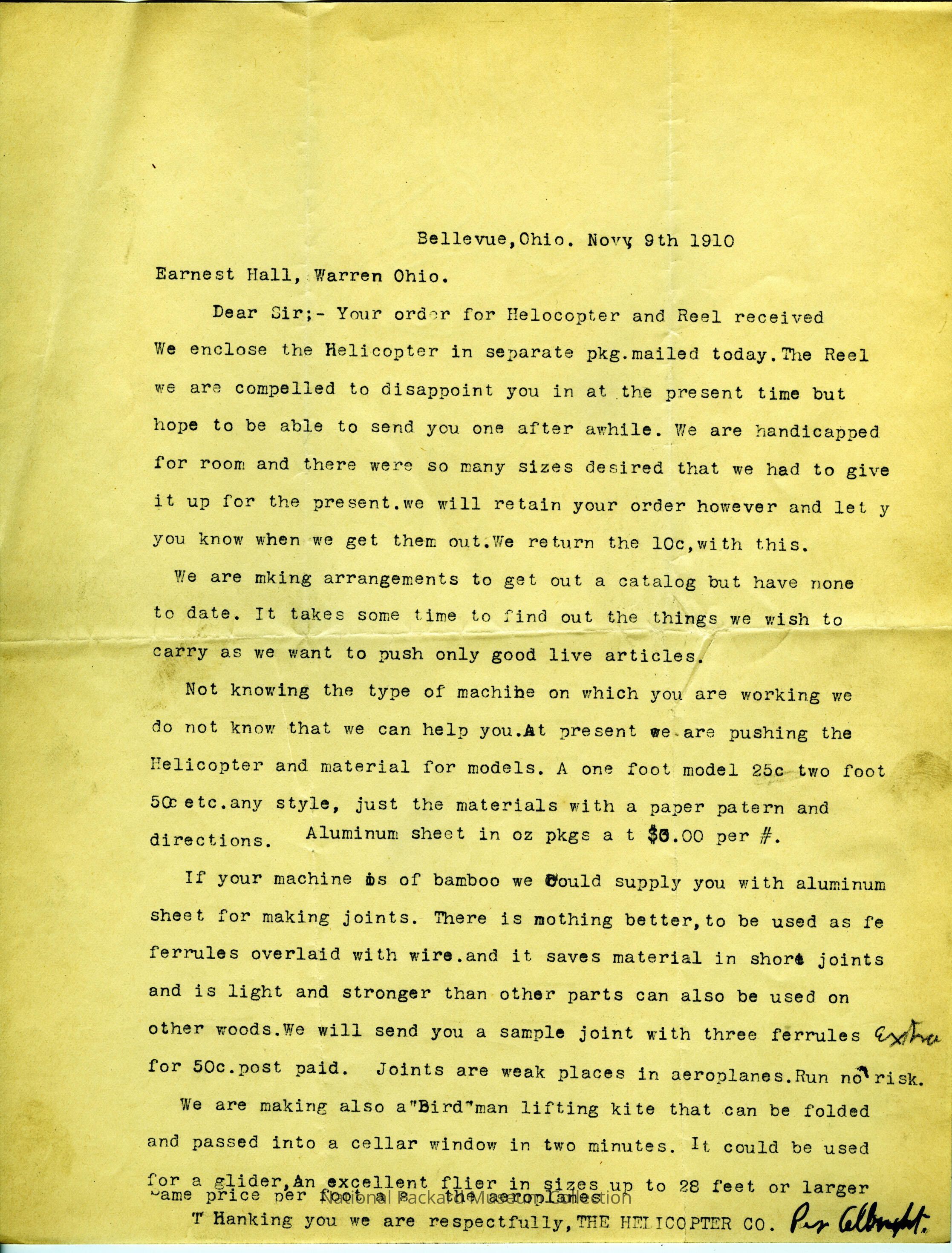 Letter confirms the order of a helicopter and reel by Ernest Hall and explains that there will be a delay in receiving the reel