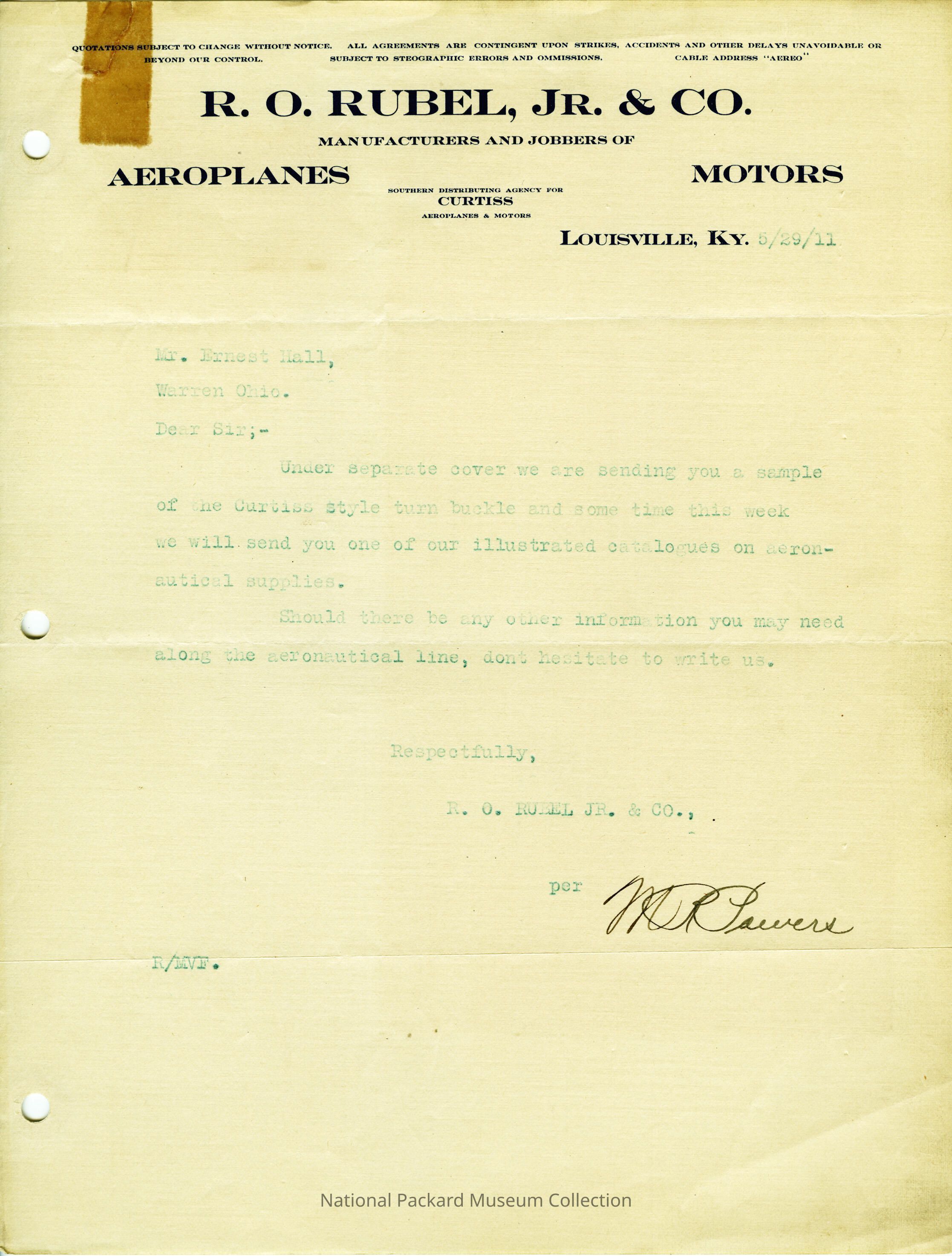 Letter Notification of sending a Curtiss style turn buckle and an illustrated cataolgue on aeronautic supplies.