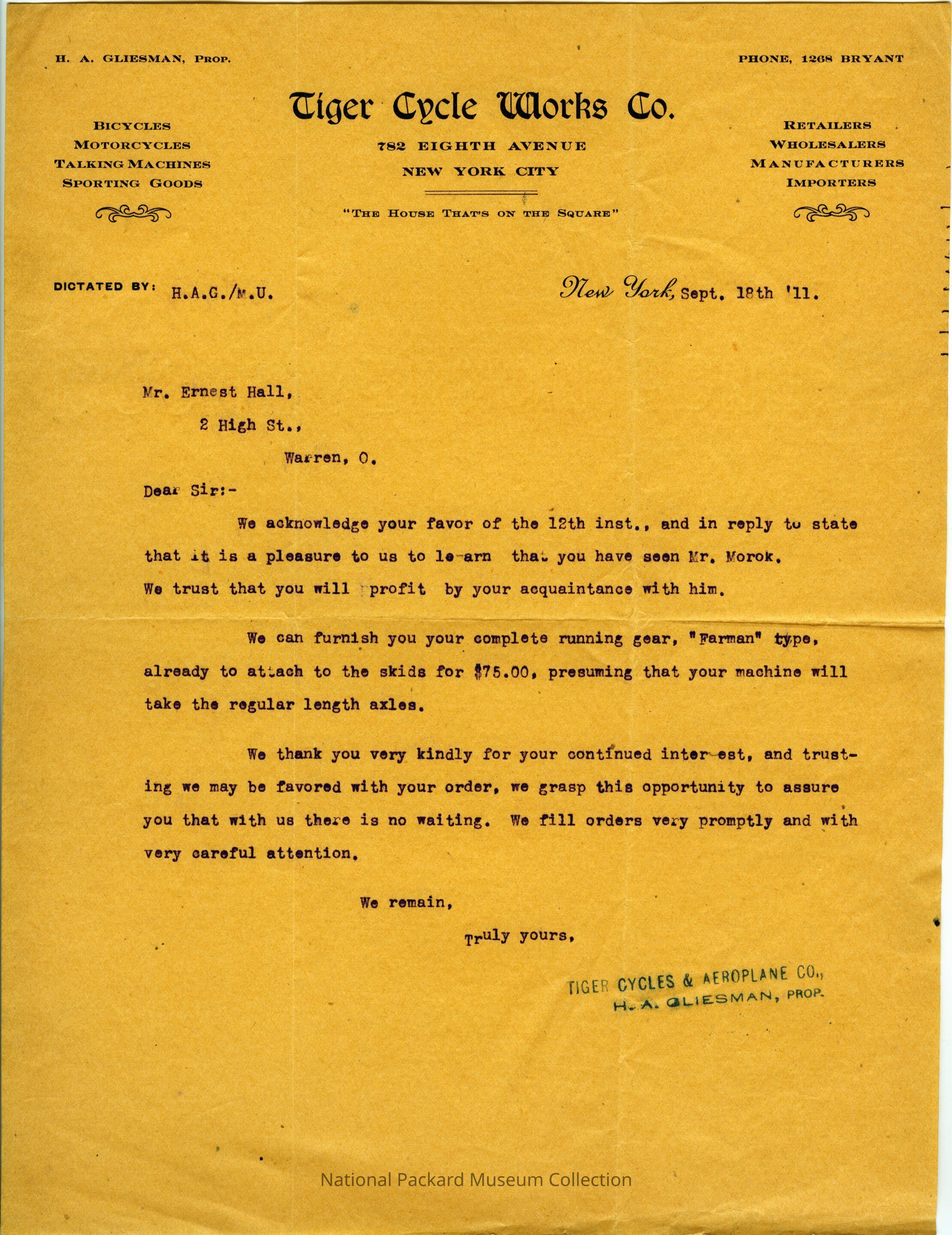The company is pleased to learn that Ernie Hall met with a Mr. Morok and hope the acquaintence will be profitable for Hall; the company can also furnish Hall with a "Farman" type running gearCollection