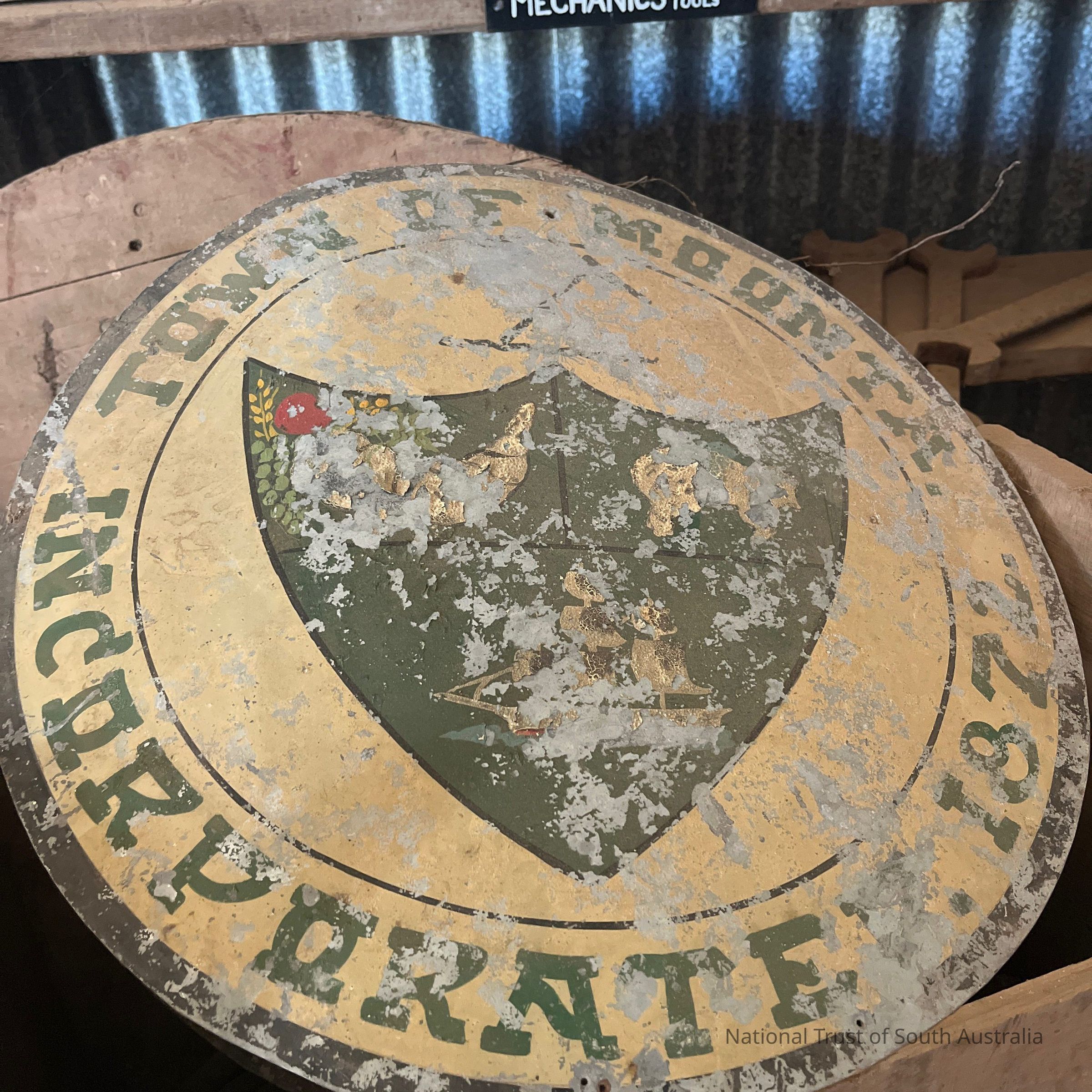 Two tin shields. Text: TOWN OF MOONTA INCORPORATED 1872