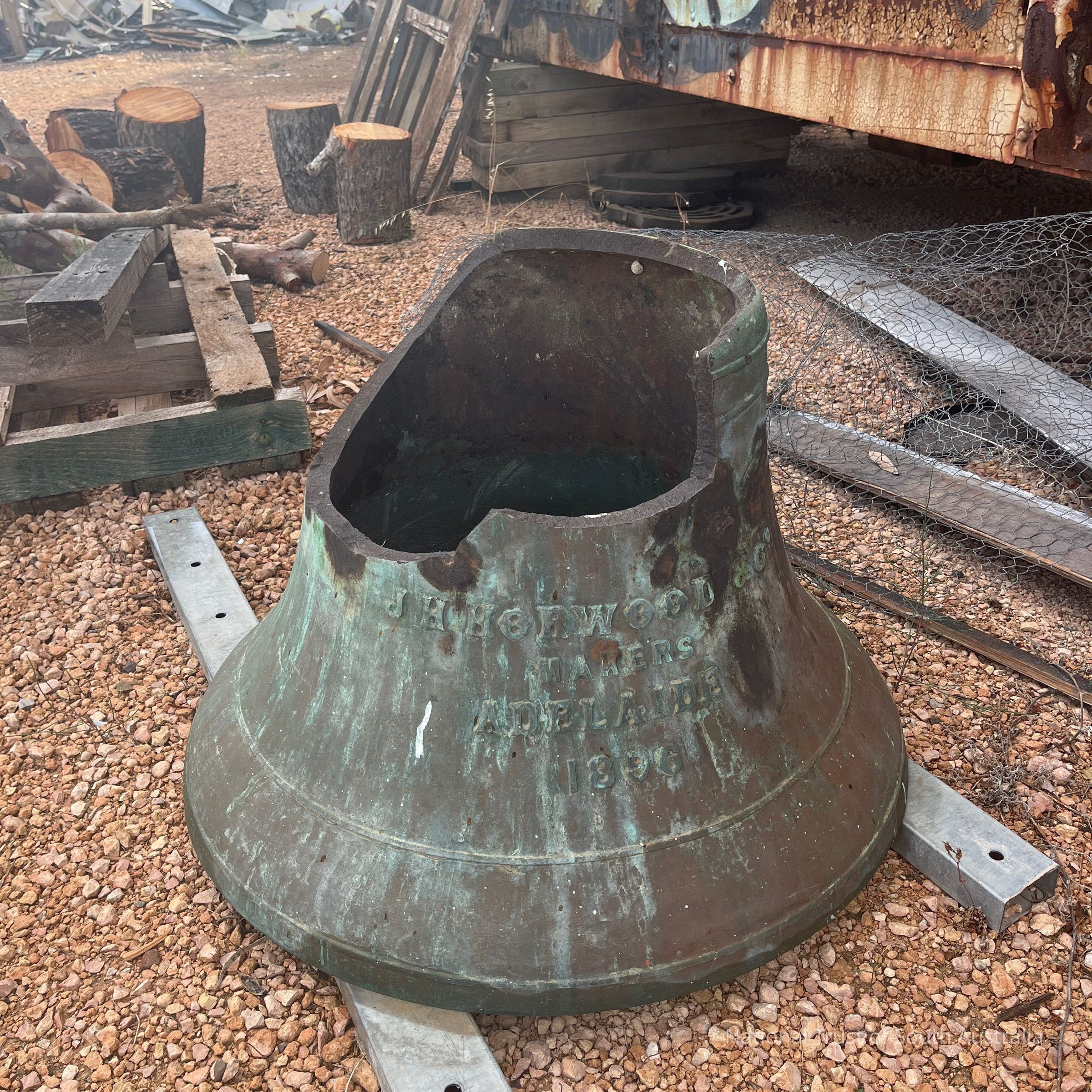 Large bell made from Moonta copper. Engraved text reads: J H HORWOOD & CO MAKERS ADELAIDE 1896