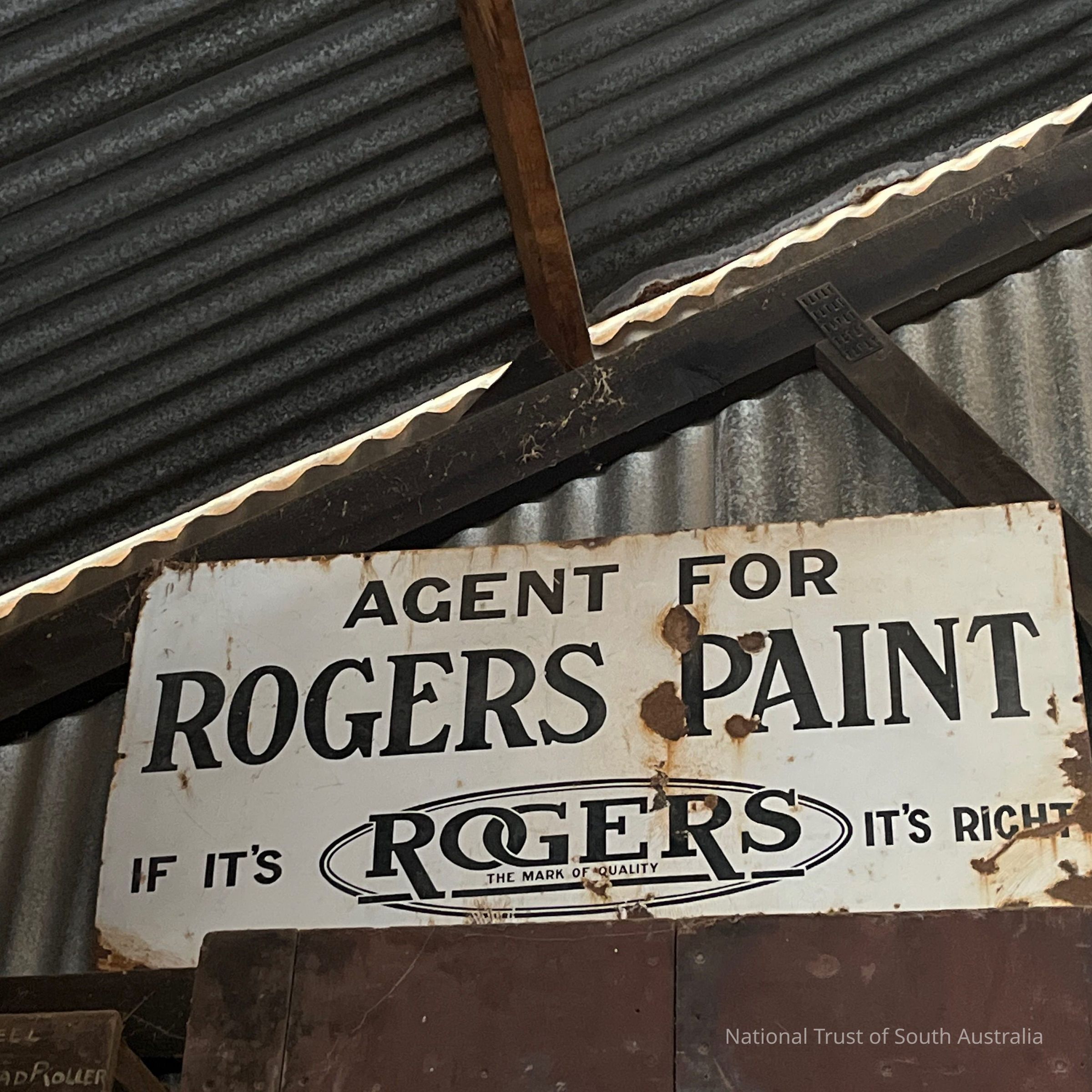 Metal sign. Text: AGENT FOR ROGERS PAINT IF ITS ROGERS ITS RIGHT