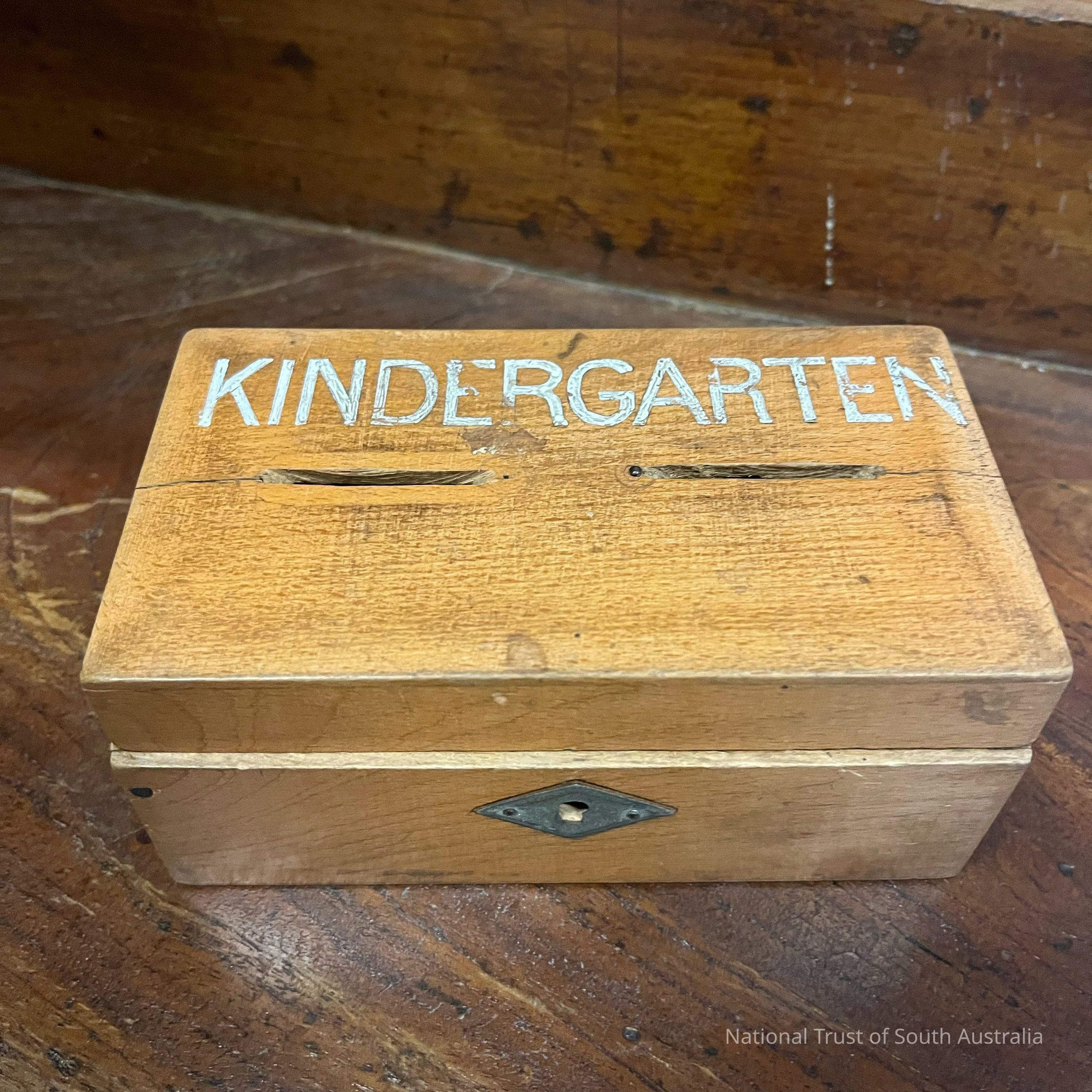 Wooden money box with two coin slots and the word “Kindergarten” written on its lid. Located Box K4