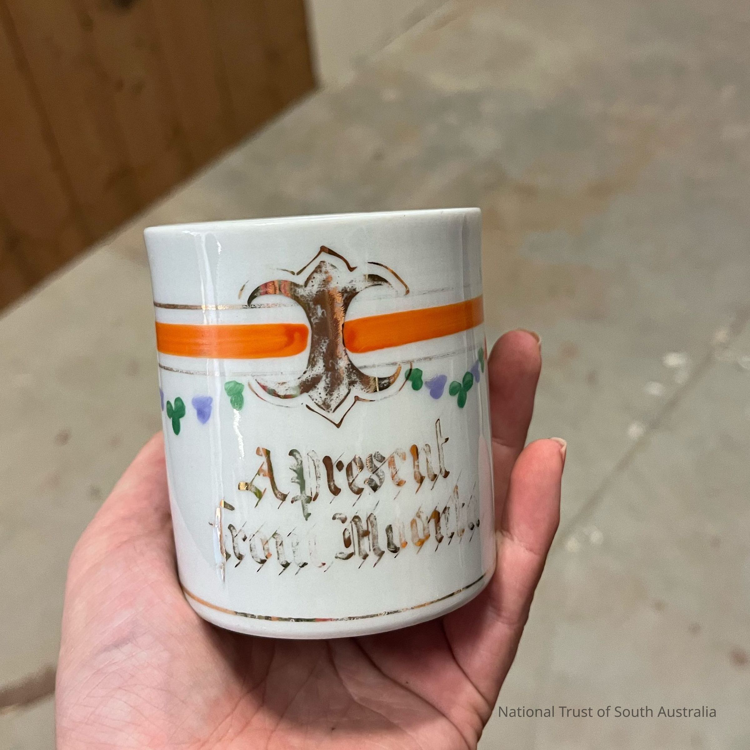 Small ceramic cup with “A Present From Moonta” written on one side. The cup is missing it’s handle. Located in Box 9K