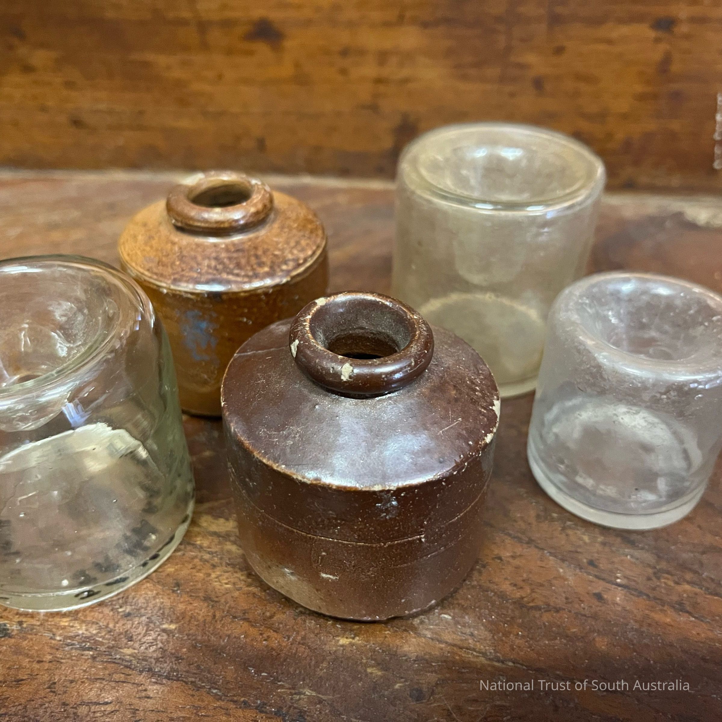 Five small ink wells. 2 ceramic, 3 glass. Located Box 15K