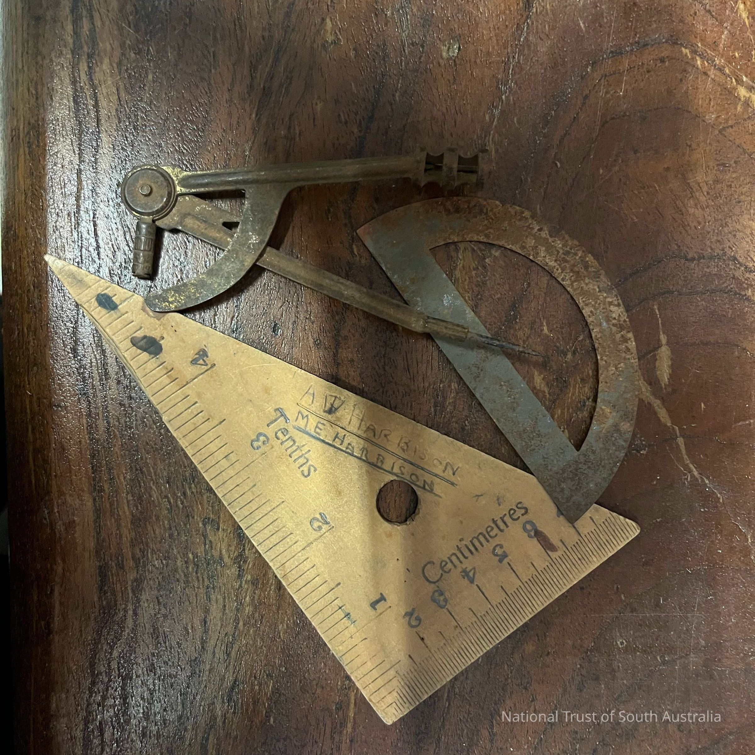 Includes protractor, compass and triangle ruler. Located in Box 15K