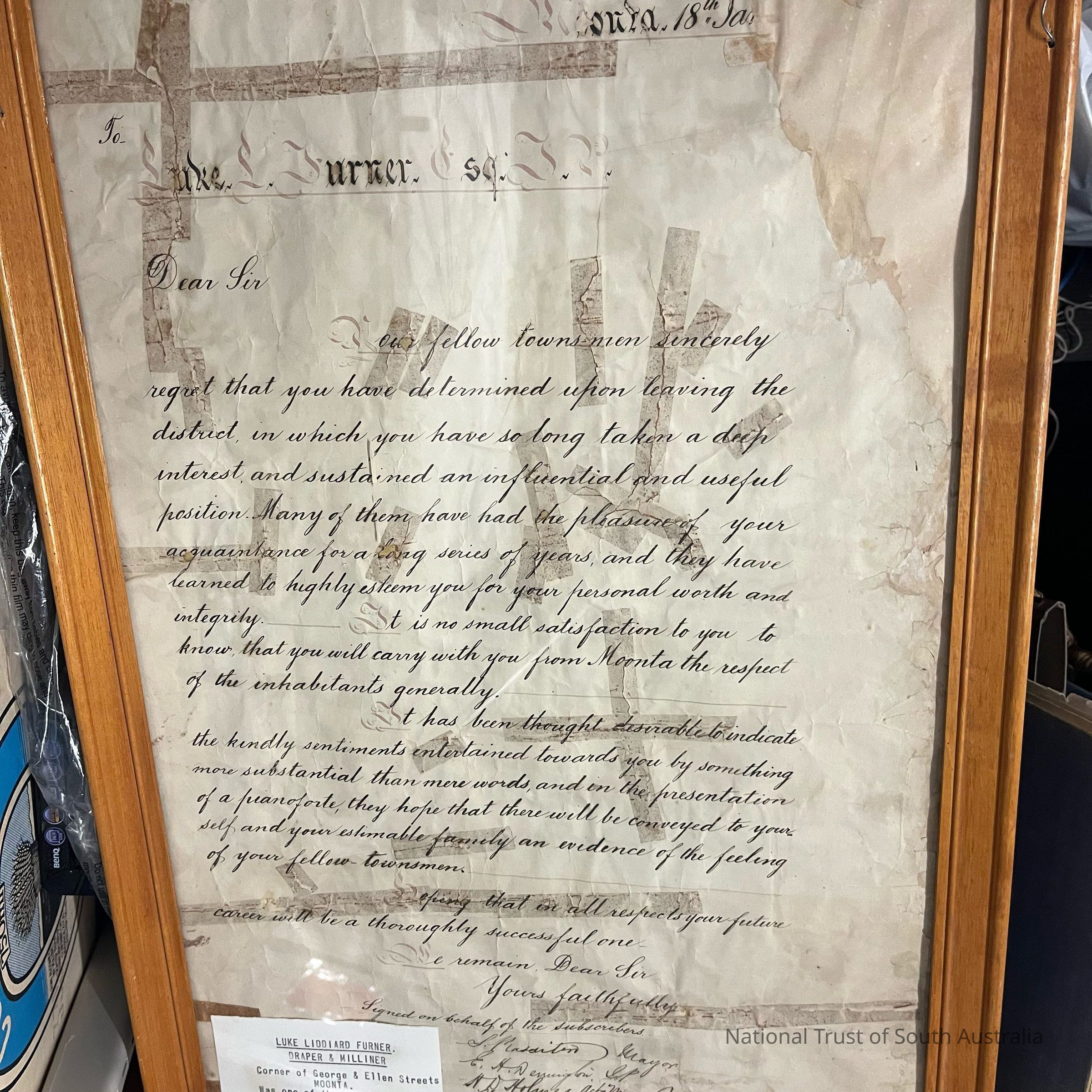 Framed letter of appreciation given to Luke Liddiard Furner, local Draper and milliner, by other businessmen when he left the district