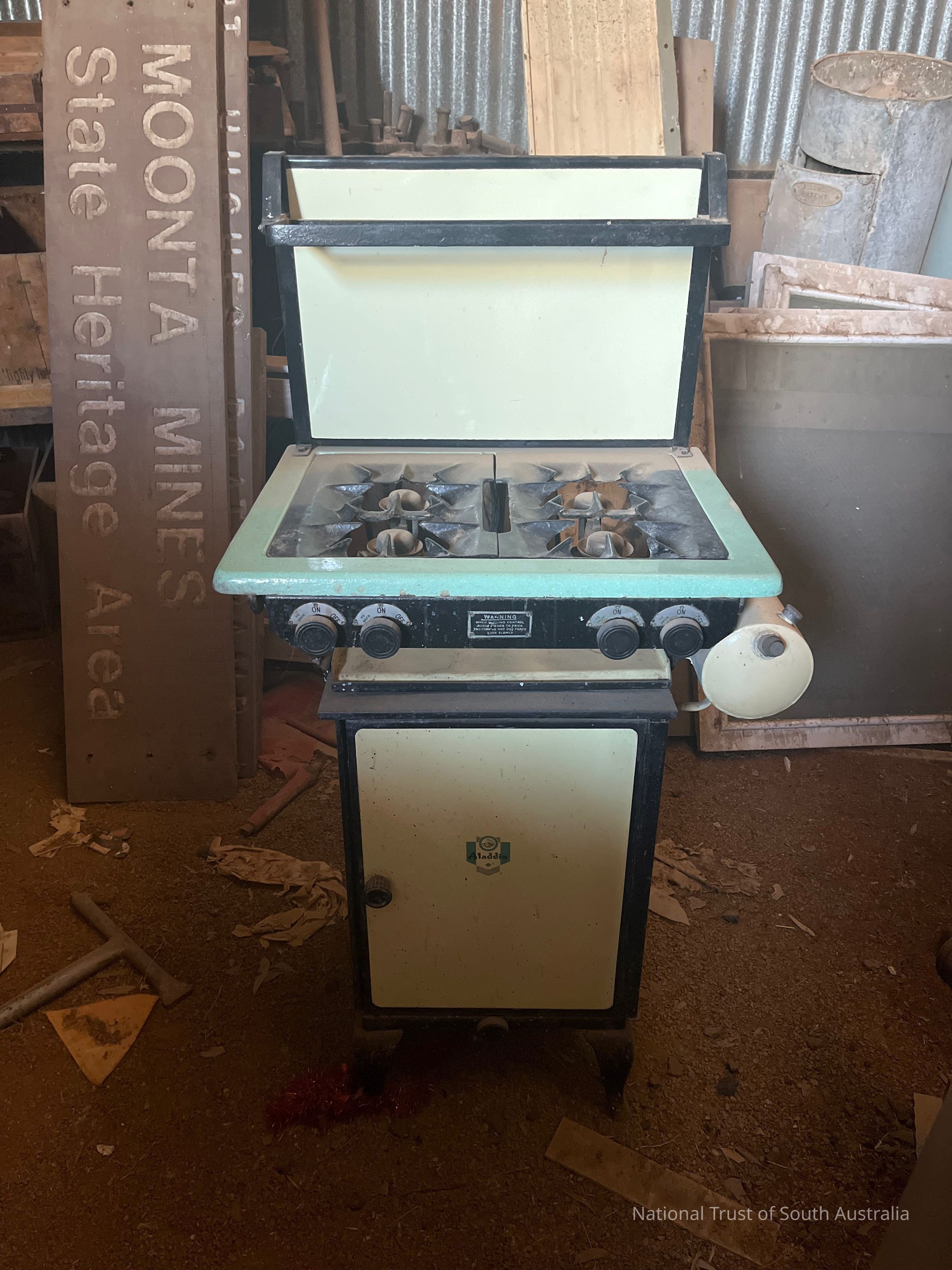 Aladdin four range stove. Warning sign reads: When burning control burner knob to prick position. Do not use force. Turn slowly.