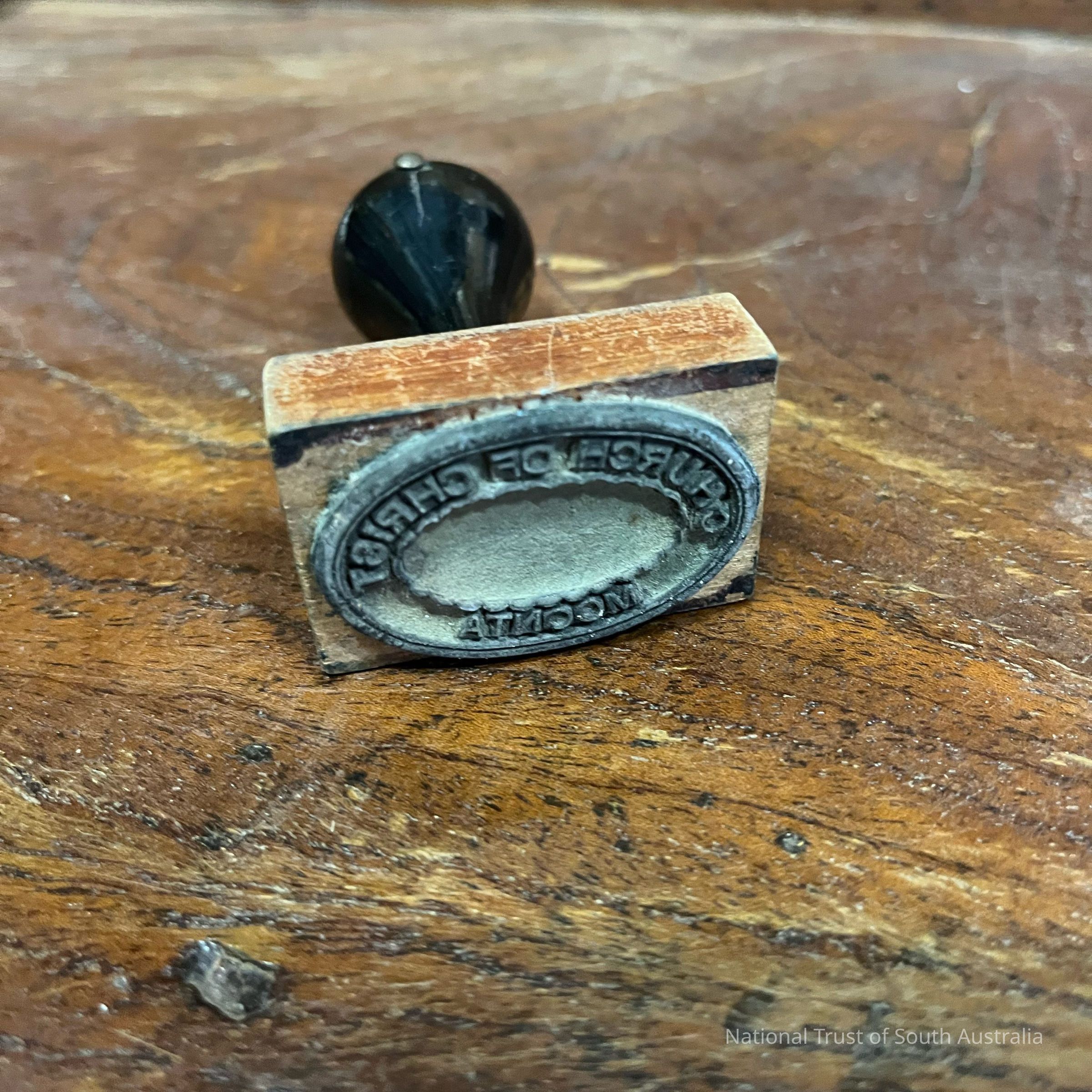 Wooden stamp embossed with CHURCH OF CHRIST MOONTA Located in Box 15K