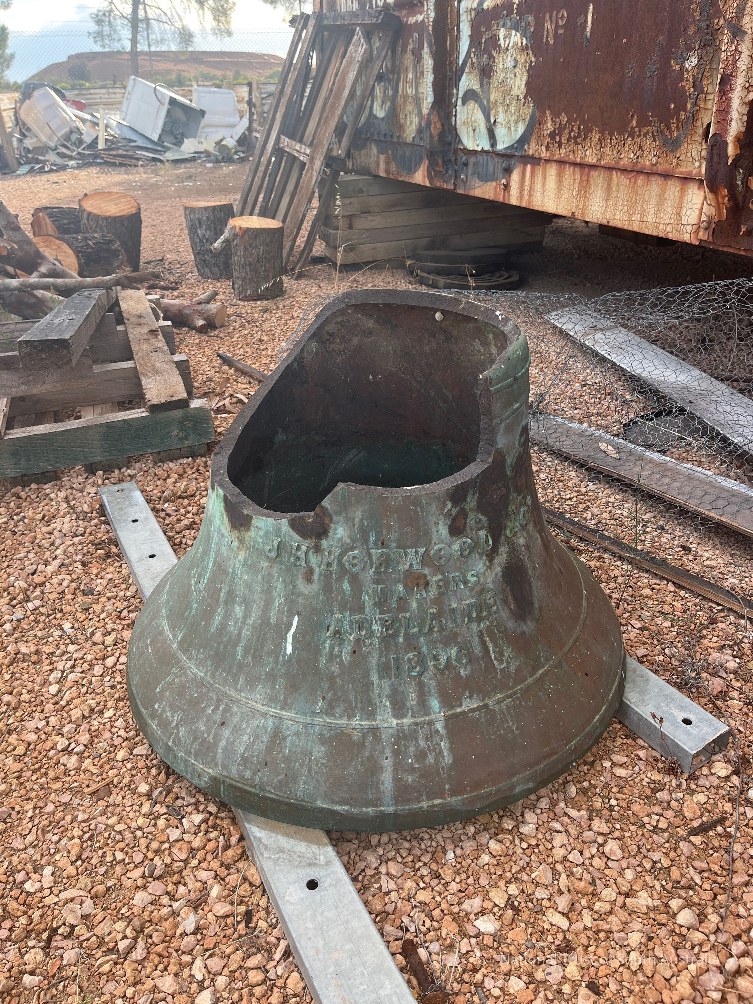 Large bell made from Moonta copper. Engraved text reads: J H HORWOOD & CO MAKERS ADELAIDE 1896