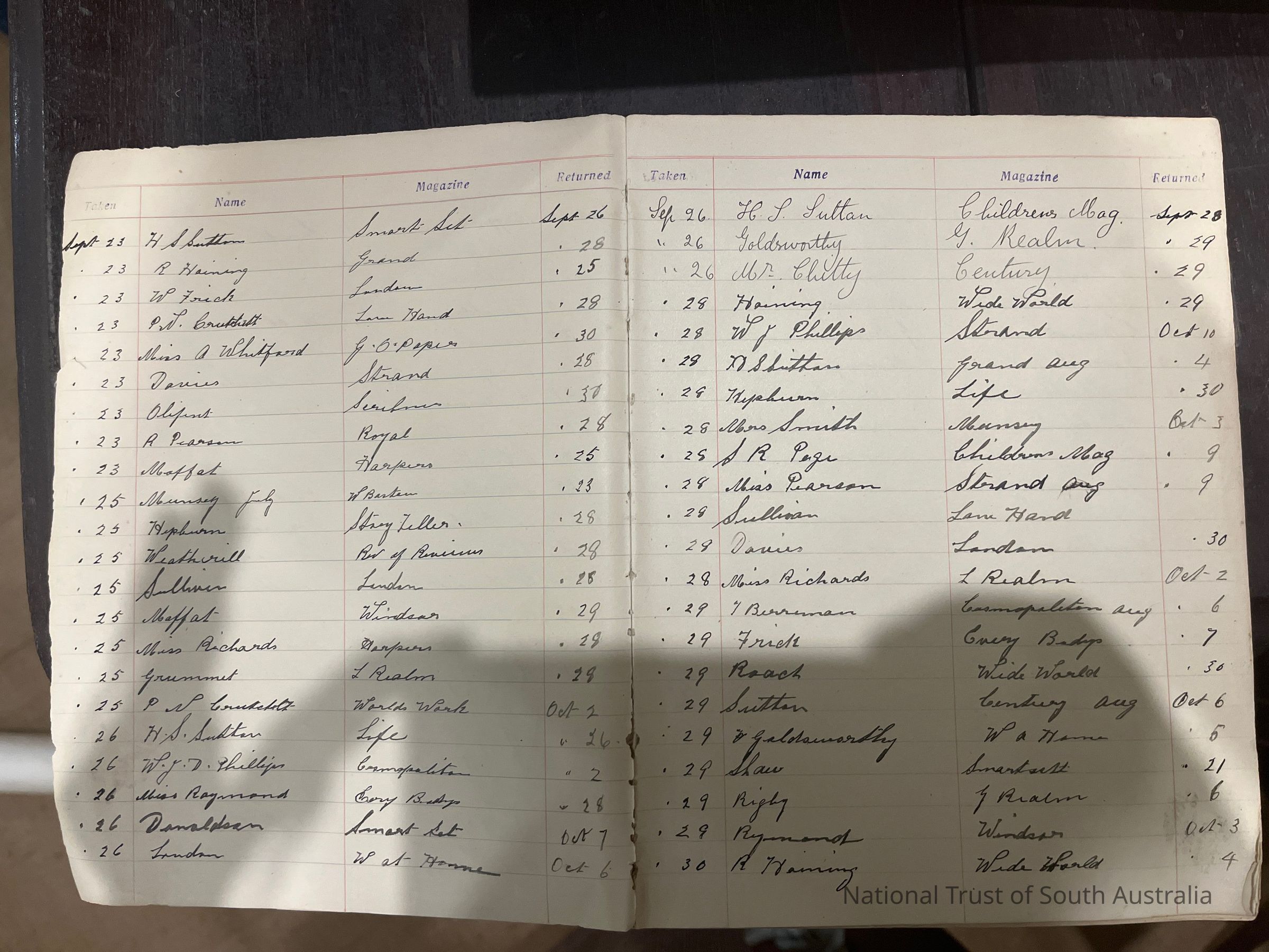 Record of dates, names, magazine borrowed and date returned