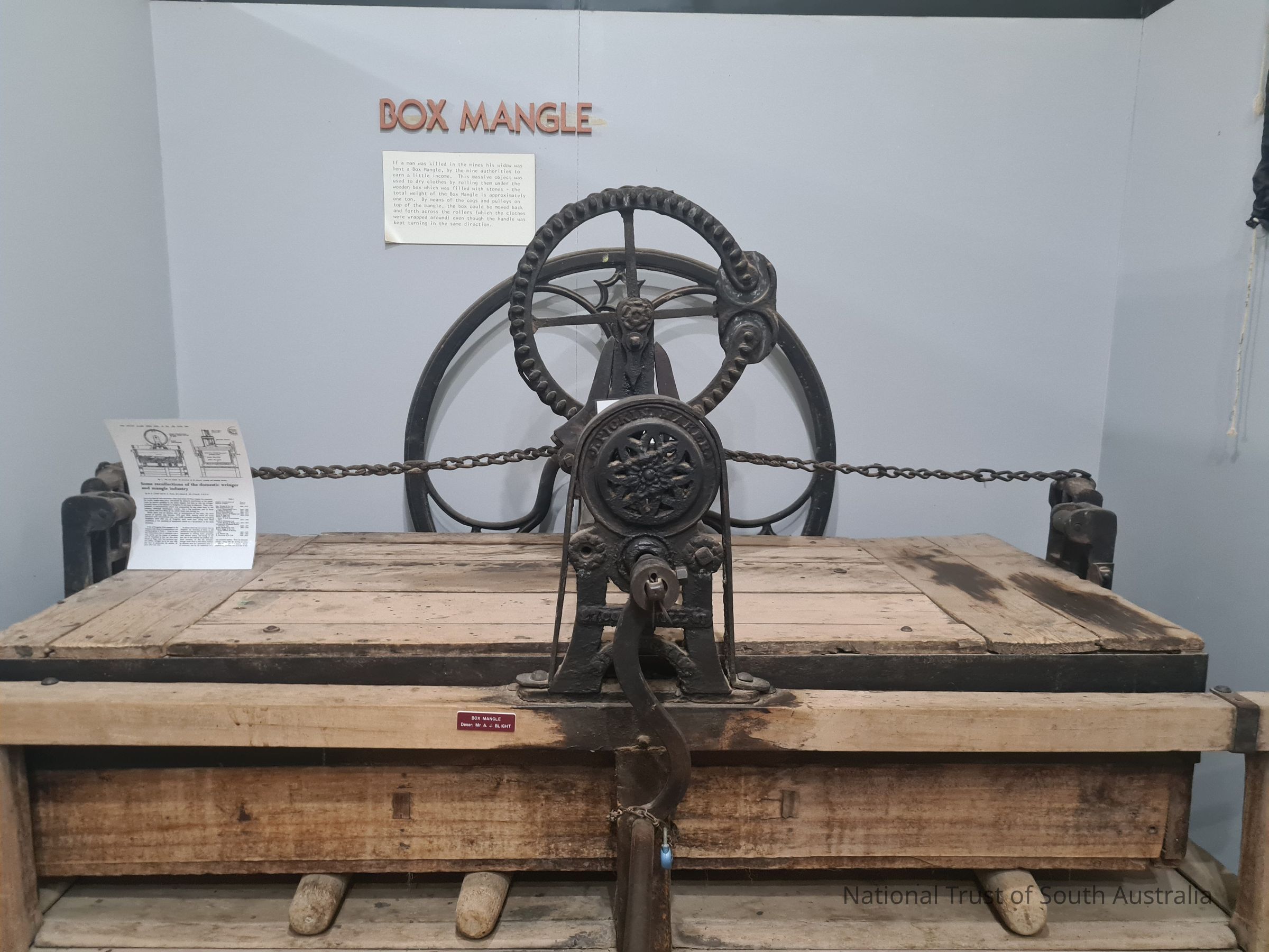 If a man was killed in a mine accident the authorities would lend the widow a box Mangle. She could press sheets for 2d per dozen and perhaps earn enough to keep her family alive.Collection