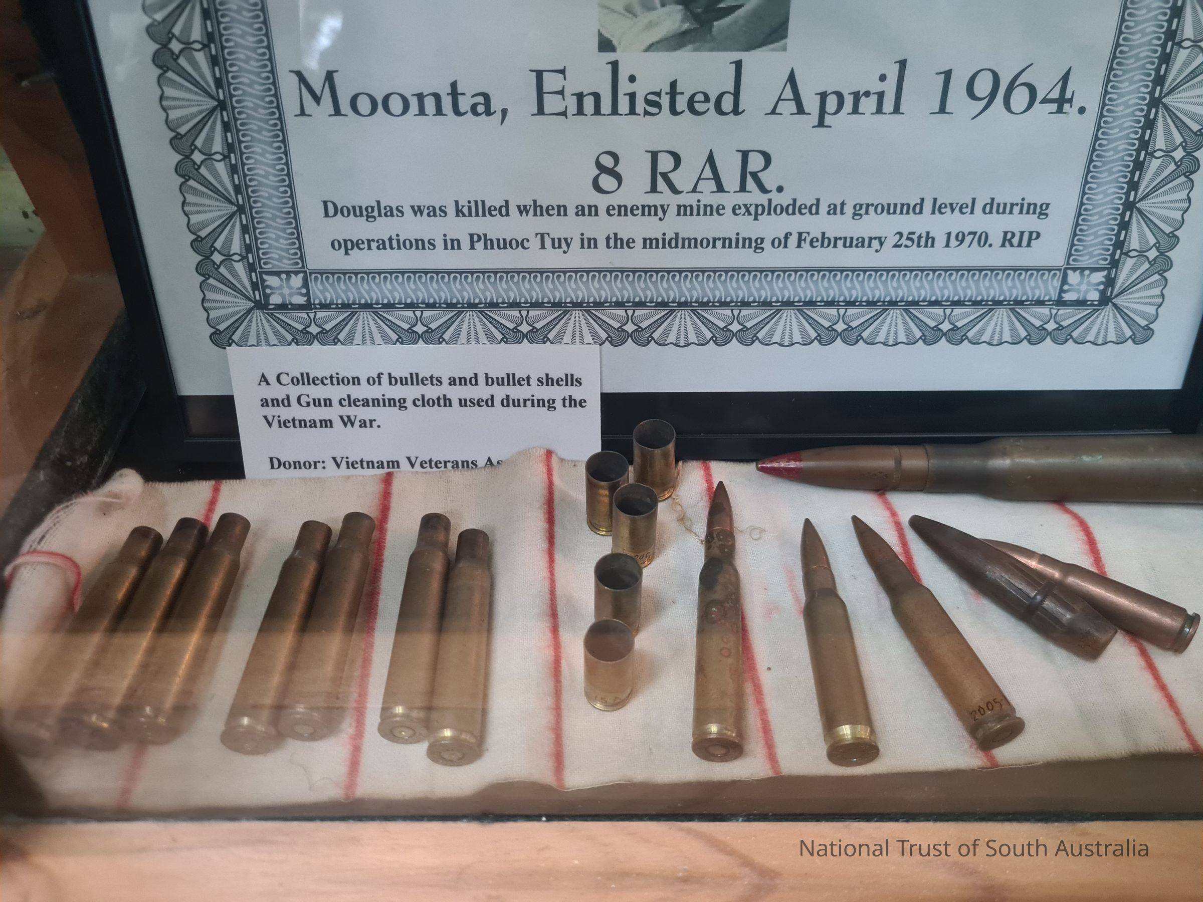 A collection of bullets and bullet Shells and gun cleaning cloth used during the Vietnam War. Donated by Vietnam Veterans AssociationCollection