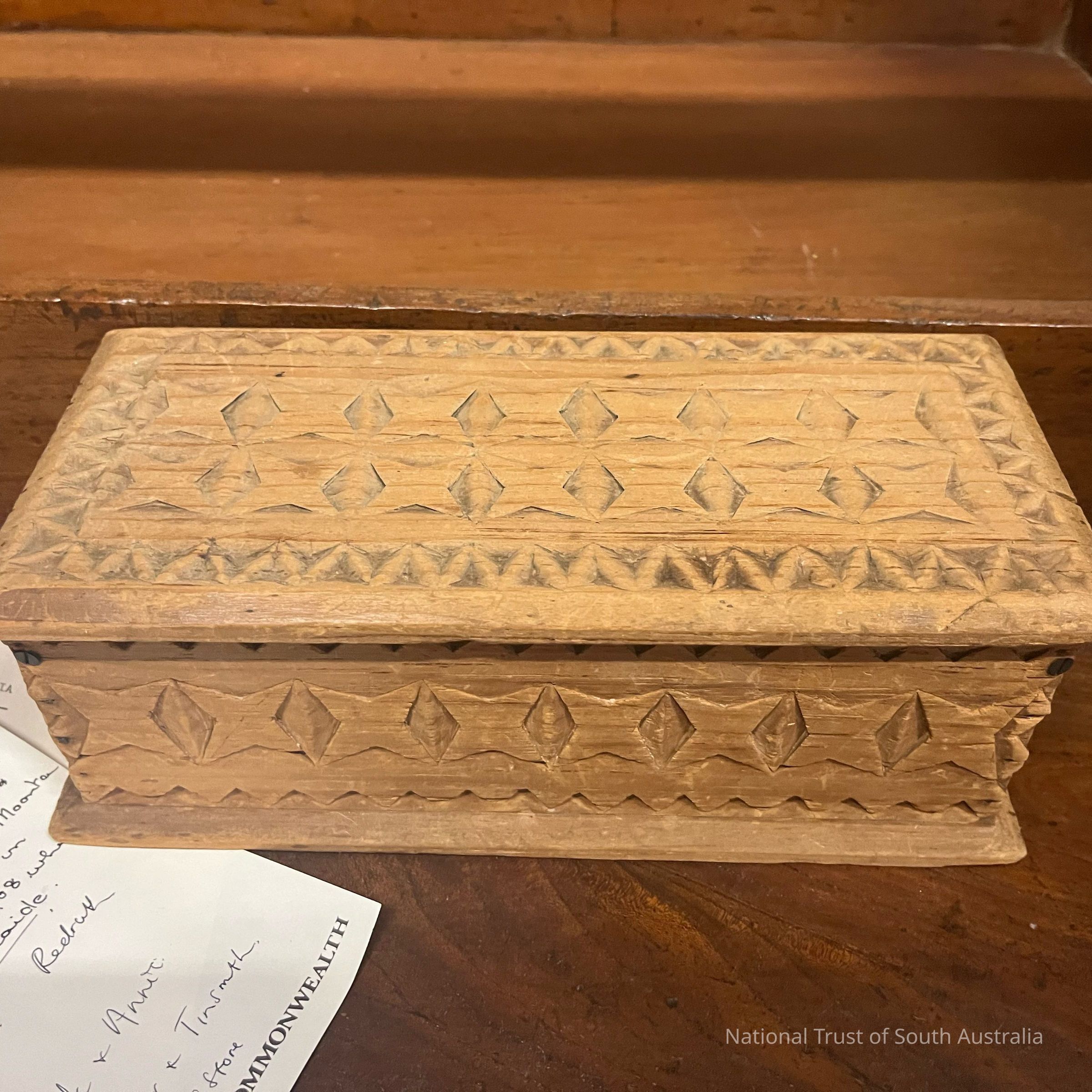 This box was made during woodwork classes at a school in Moonta (not specified) by either Cecil or Ken Jewell (brothers). Located in Box K2
